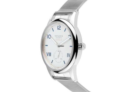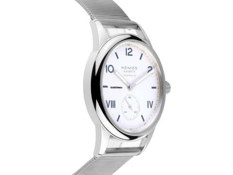 Nomos Glashütte Club Campus Neomatik Stahl Automatik Armband Stahl Gehäuse Edelstahl poliert, zweiteilig, Gehäusedurchmesser ohne Krone 39,5mm, Gehäusehöhe 8,4mm. Lünette Edelstahl glatt und poliert. Armband Edelstahl satiniert, Klappschließe Edelstahl mit Hersteller-Logo. Zifferblatt weiß versilbert, galvanisiert mit arabischen Ziffern und Indexen in blau nachleuchtend sowie Edelstahl Leuchtzeigern. Uhrwerk Automatik, Nomos Manufakturkaliber DUW3001 mit 27 Edelsteinen, NOMOS-Swing-System, ultraflach. Anzeige von Stunde und Minute über Zeiger aus der Mitte, kleine Sekunde mit Sekundenstopp zur sekundengenauen Einstellung der Uhrzeit bei 6 Uhr. Saphirglas kratzfest und doppelseitig entspiegelt. Krone geriffelt mit Hersteller-Logo. Boden Edelstahl verschraubt und graviert. Gewicht der Uhr inklusive Armband 93g. Wasserdicht bis 20 ATM. Referenznummer: 765, ID: ST116036340723RE-2580, Artikelnummer: 10000070623. Original Nomos Box und Garantie Papiere von Juni 2023, Full Set. Neu. Lieferzeit sofort.