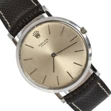 Rolex Cellini Ultra-Thin Weißgold 18KT, Baujahr 1960, Weißgold 18KT glatte Lünette, Plexiglas, silberfarbenes Zifferblatt mit Indexen und Baton-Zeigern Weißgold 18KT, manuelles mechanisches Uhrwerk, kakaofarbenes Rindslederarmband mit weißgoldener Dornschließe original Rolex.