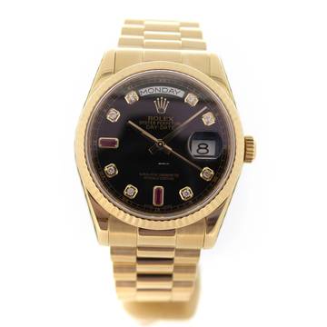 Diese Rolex-Uhr verfügt über eine 36 mm Gelbgold Gehäuse. Die Uhr verfügt über ein braunes Zifferblatt. Die Uhr ist mit einem Gelbgoldarmband ausgestattet.