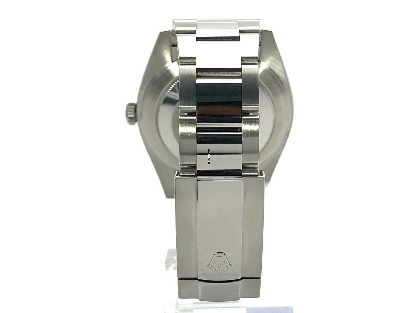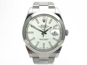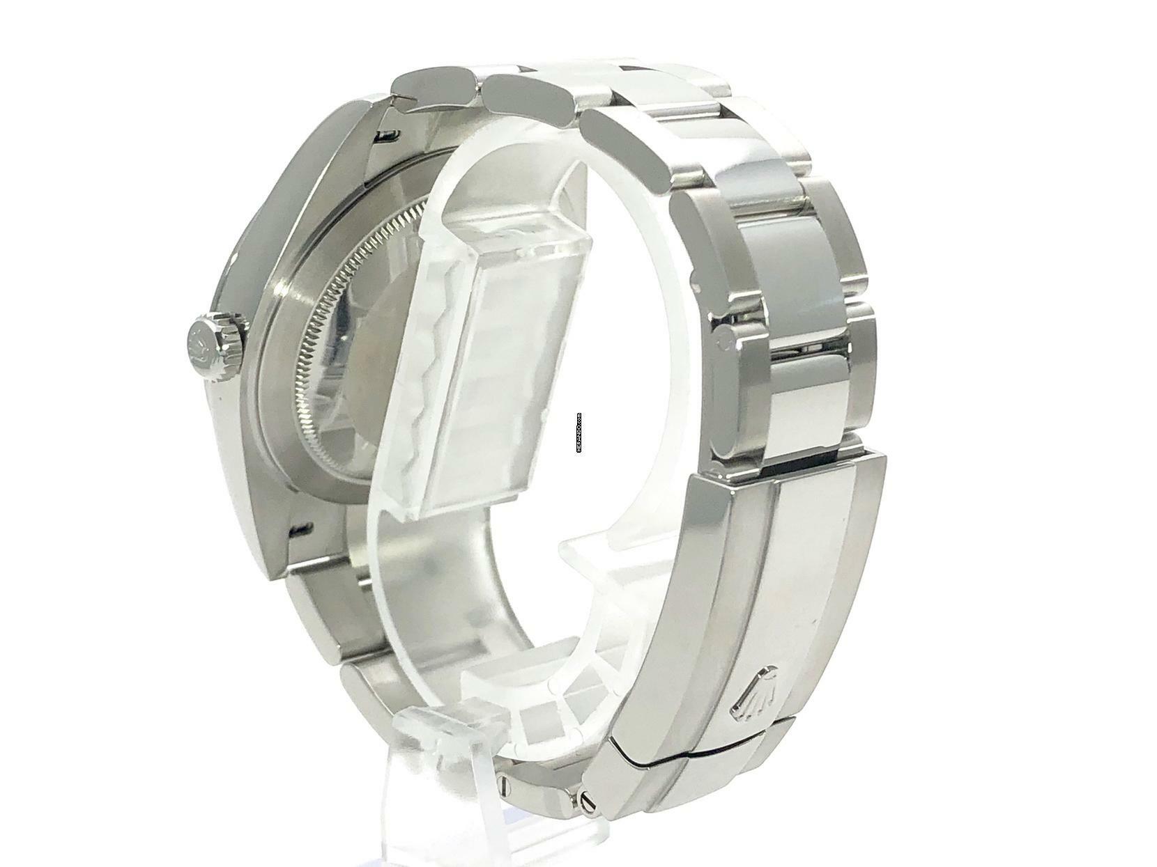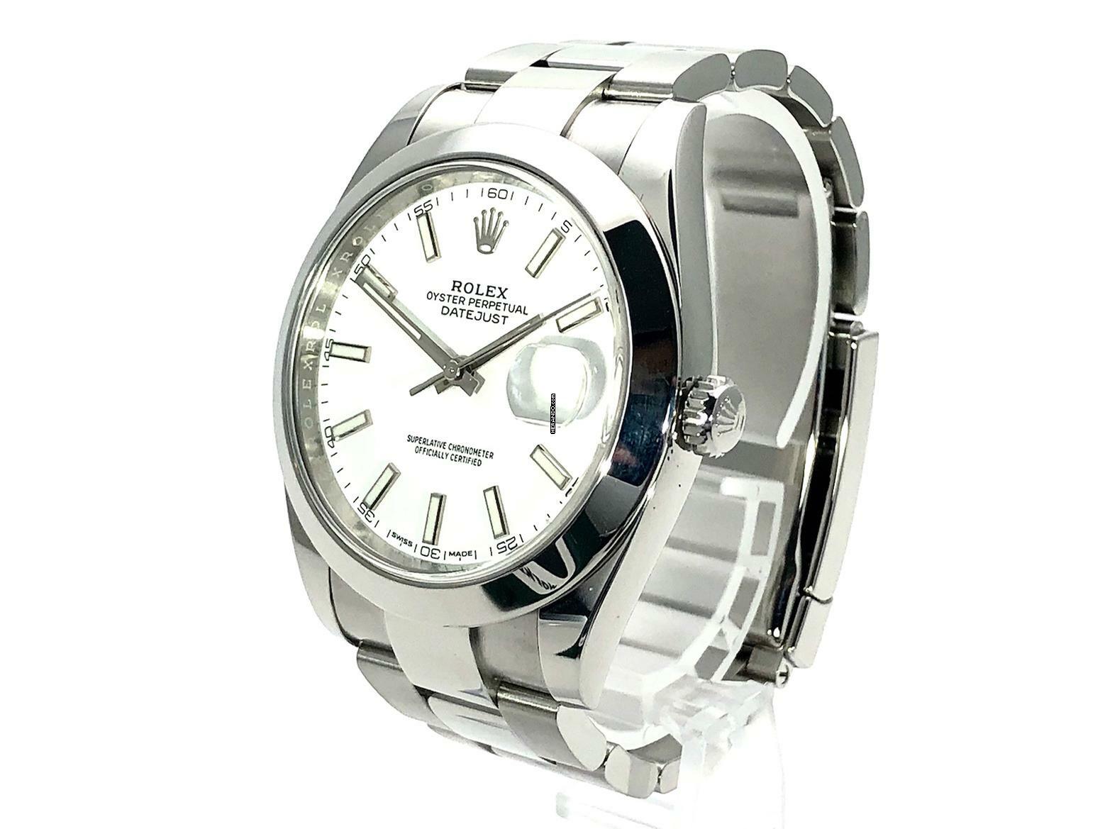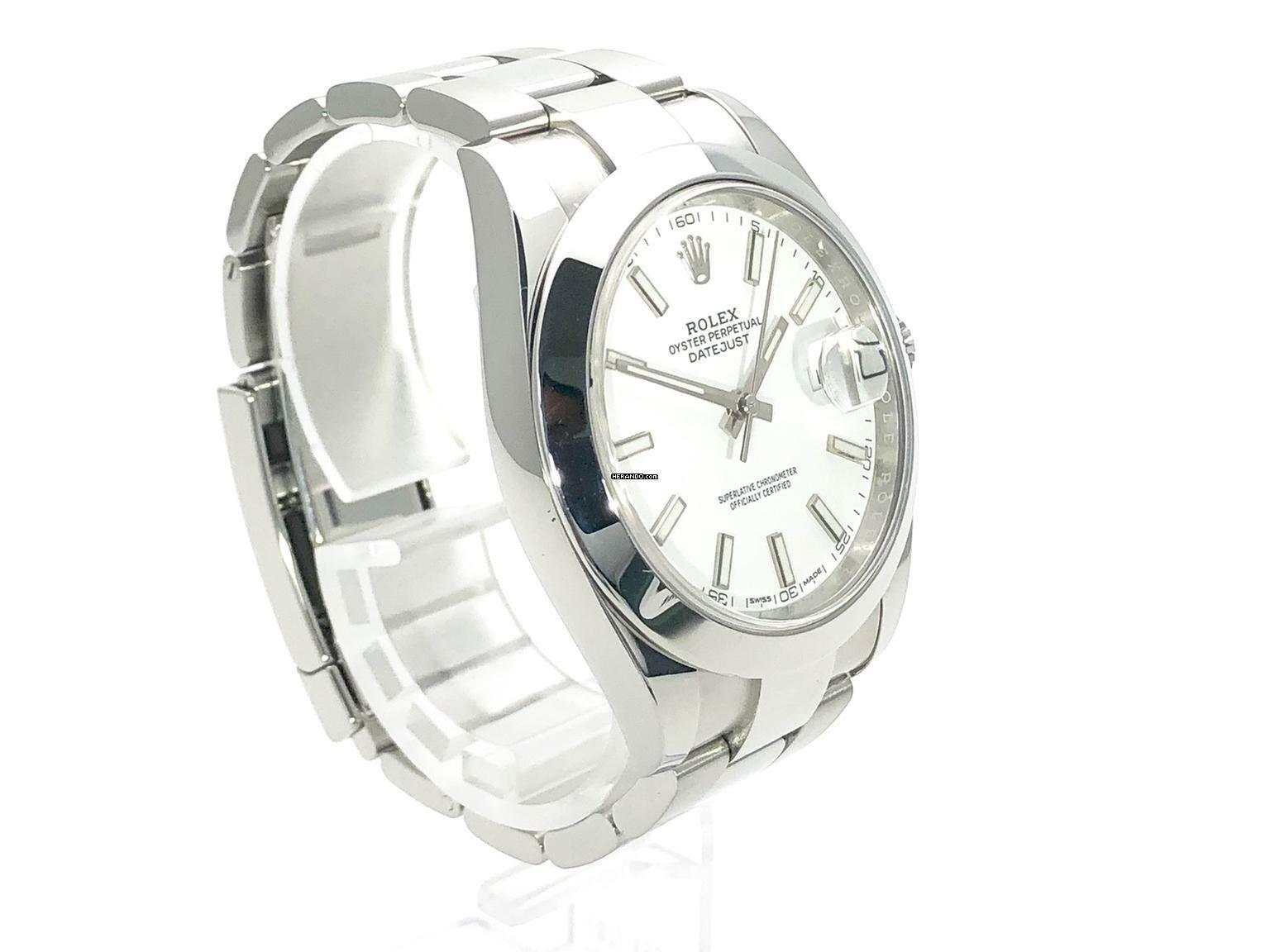 Gehäuse aus Edelstahl poliert und satiniert, Gehäusedurchmesser 41 mm, polierte Edelstahl Lünette, Oyster Edelstahlband poliert und satiniert mit Faltschließe, Zifferblatt Weiß mit 18 kt Weißgold LeuchtIndexen, Leuchtzeiger, Automatikwerk, Rolex Manufakturkaliber 3235, Chronometer, 70 Stunden Gangreserve, Datumsanzeige, kratzfestes Saphirglas, verschraubte Krone, Edelstahlboden verschraubt, Wasserdicht bis zu 10 bar.