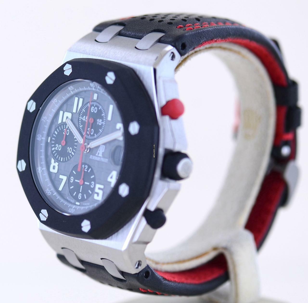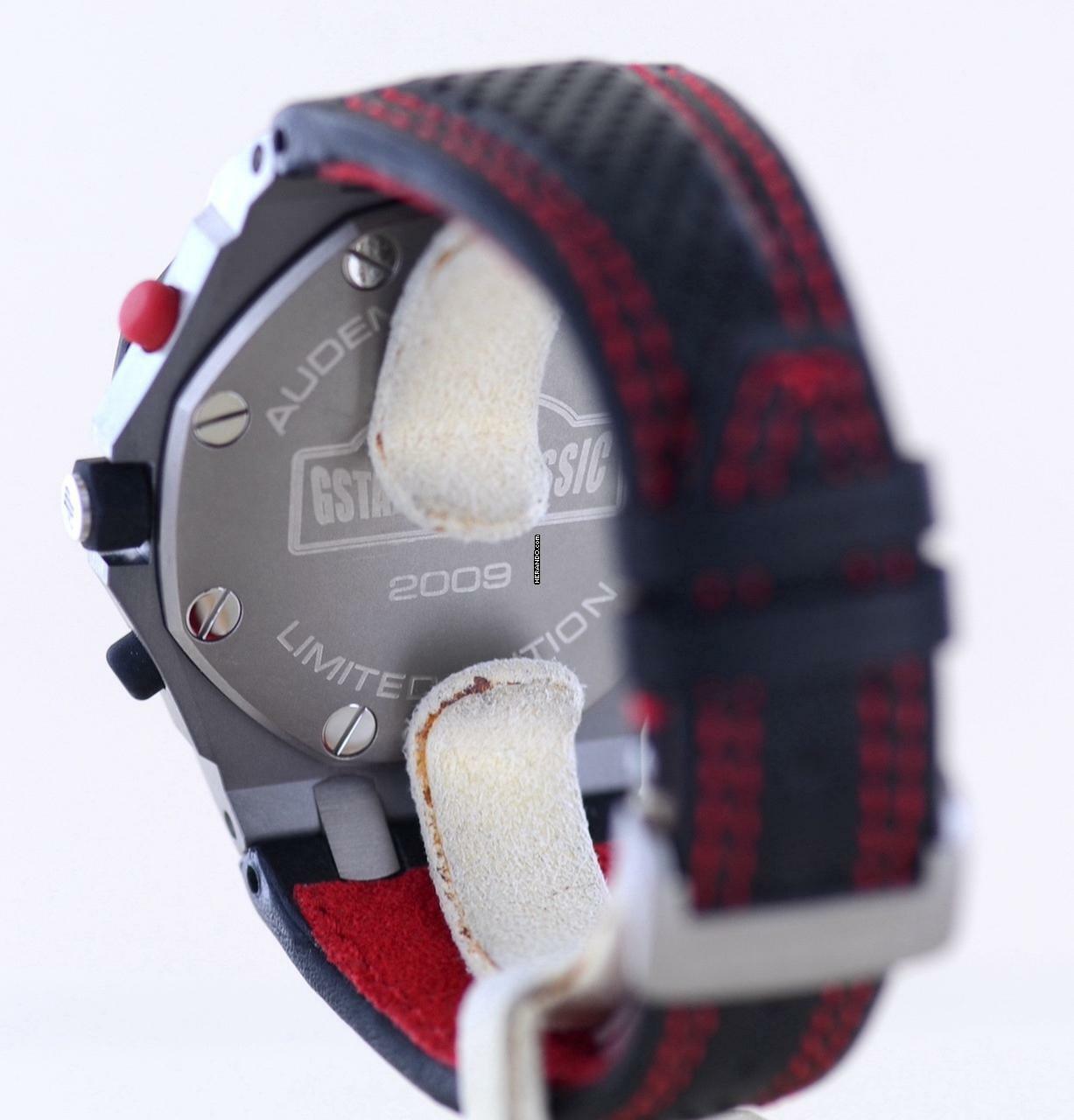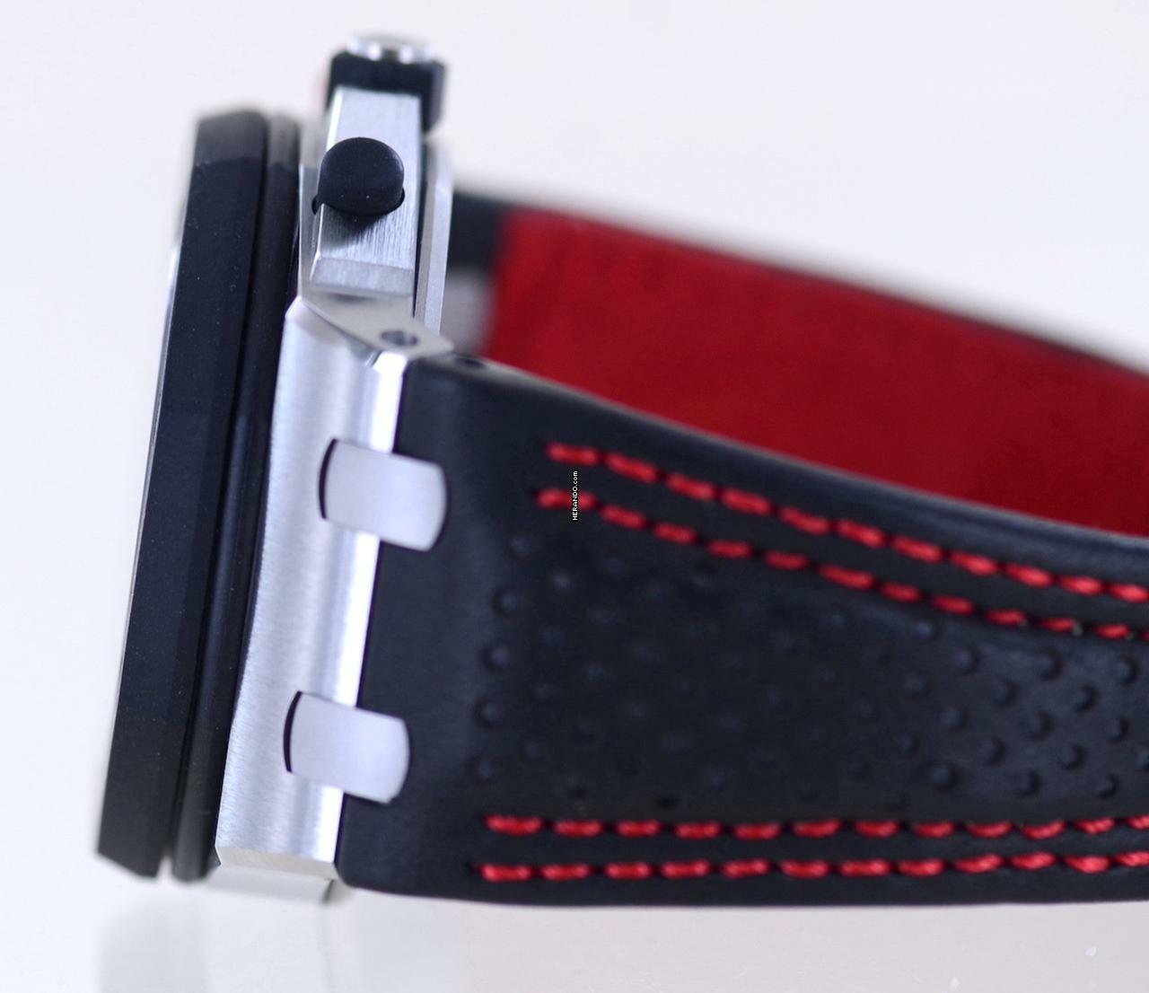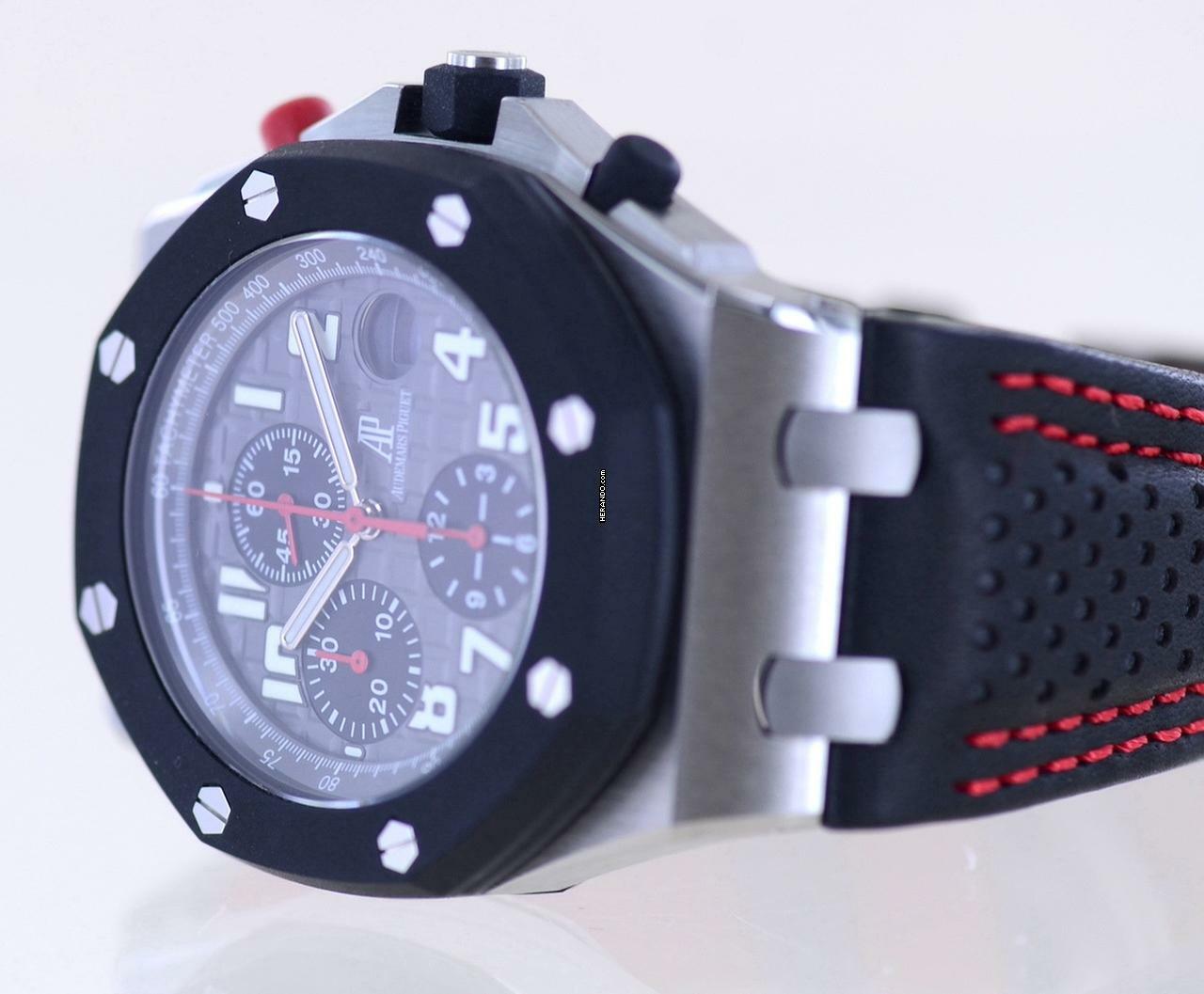 Das graue Zifferblatt mit Mega Tapisserie-Verzierung und den drei schwarzen Totalisatoren fällt bei dieser schönen Uhr sofort auf. Die in Weißgold gefassten Ziffern und Zeiger harmonieren perfekt mit den weißgoldenen Schrauben auf der markanten schwarzen Kautschuklünette. Dieser Offshore Chronograph aus dem Hause Audemars Piguet kommt am neuen schwarz-roten Lederband und setzt Maßstäbe. Mit dem modernen Zifferblatt und im sportlich zeitlosen Titangehäuse punktet er optisch und überzeugt zudem technisch mit zahlreichen Funktionen.Dieses Sondermodell wurde in 2009 in einer kleinen Stückzahl von nur 50 Exemplaren aufgelegt. Entsprechend selten ist eine derartige Offshore in freier Wildbahn zu sehen. Der Preis lag bei 39.950 Euro und war damals schon sündhaft teuer.