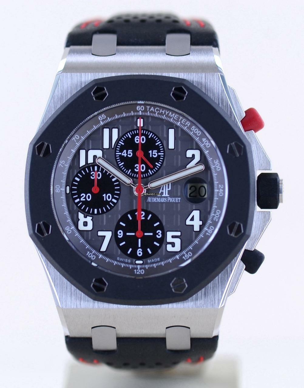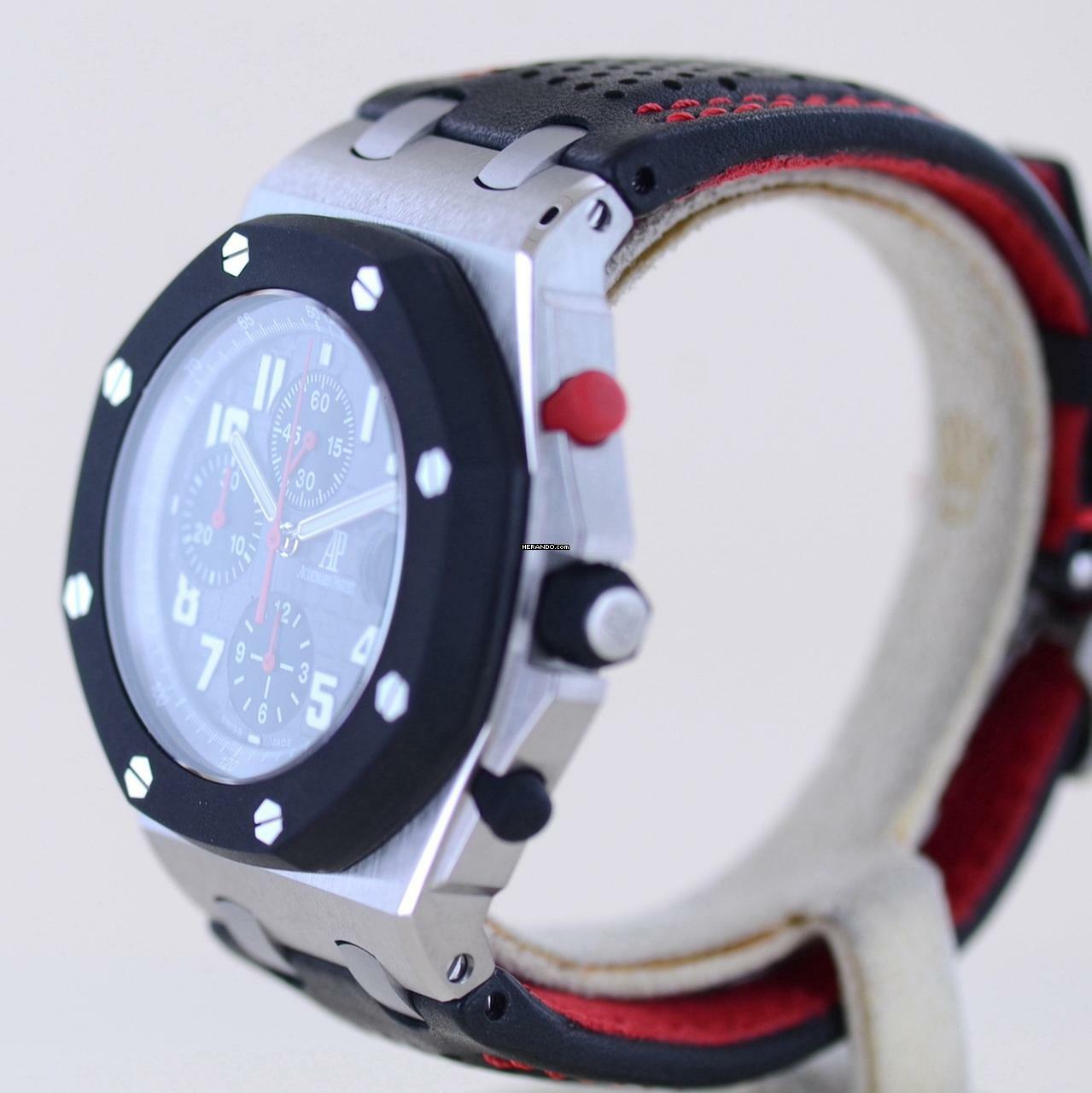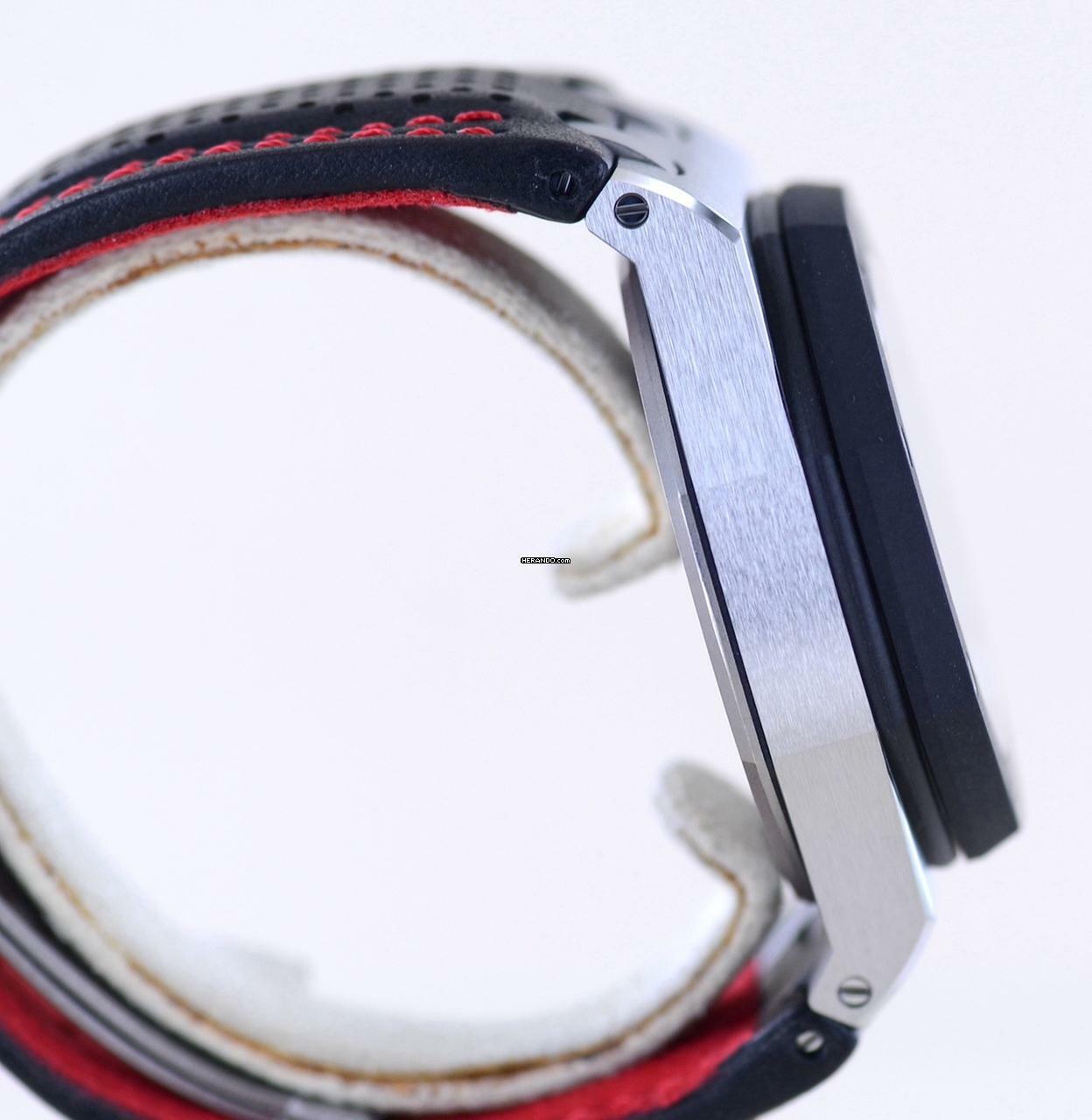 Das graue Zifferblatt mit Mega Tapisserie-Verzierung und den drei schwarzen Totalisatoren fällt bei dieser schönen Uhr sofort auf. Die in Weißgold gefassten Ziffern und Zeiger harmonieren perfekt mit den weißgoldenen Schrauben auf der markanten schwarzen Kautschuklünette. Dieser Offshore Chronograph aus dem Hause Audemars Piguet kommt am neuen schwarz-roten Lederband und setzt Maßstäbe. Mit dem modernen Zifferblatt und im sportlich zeitlosen Titangehäuse punktet er optisch und überzeugt zudem technisch mit zahlreichen Funktionen.Dieses Sondermodell wurde in 2009 in einer kleinen Stückzahl von nur 50 Exemplaren aufgelegt. Entsprechend selten ist eine derartige Offshore in freier Wildbahn zu sehen. Der Preis lag bei 39.950 Euro und war damals schon sündhaft teuer.