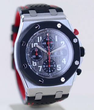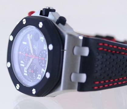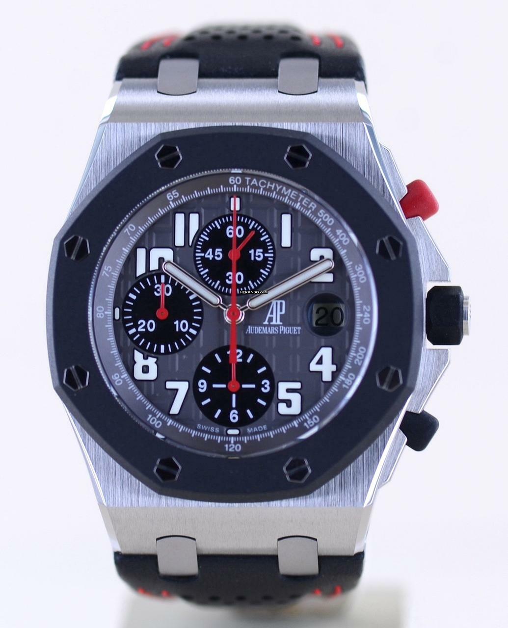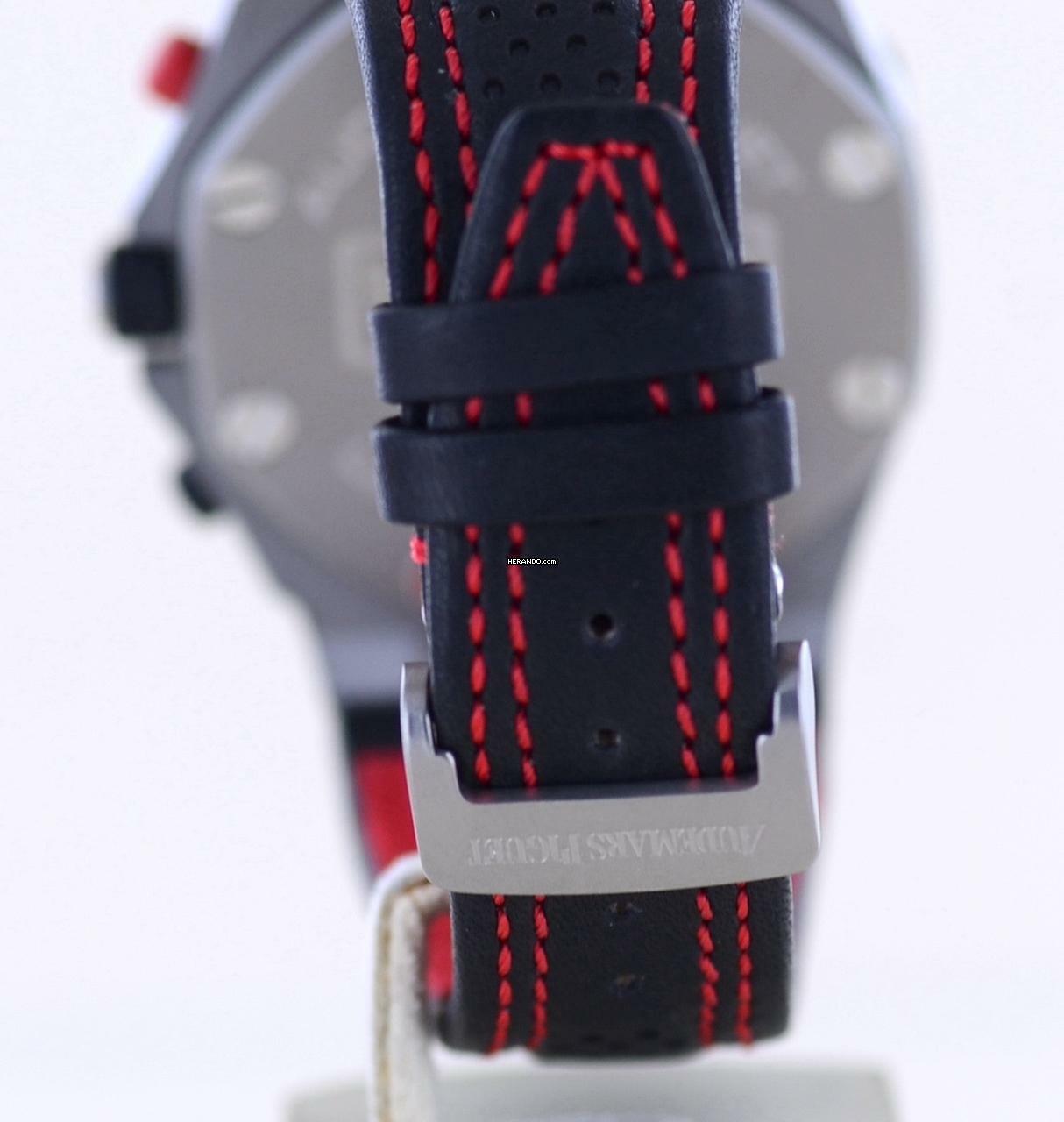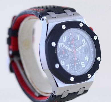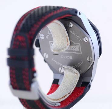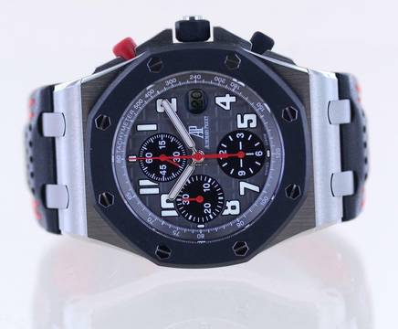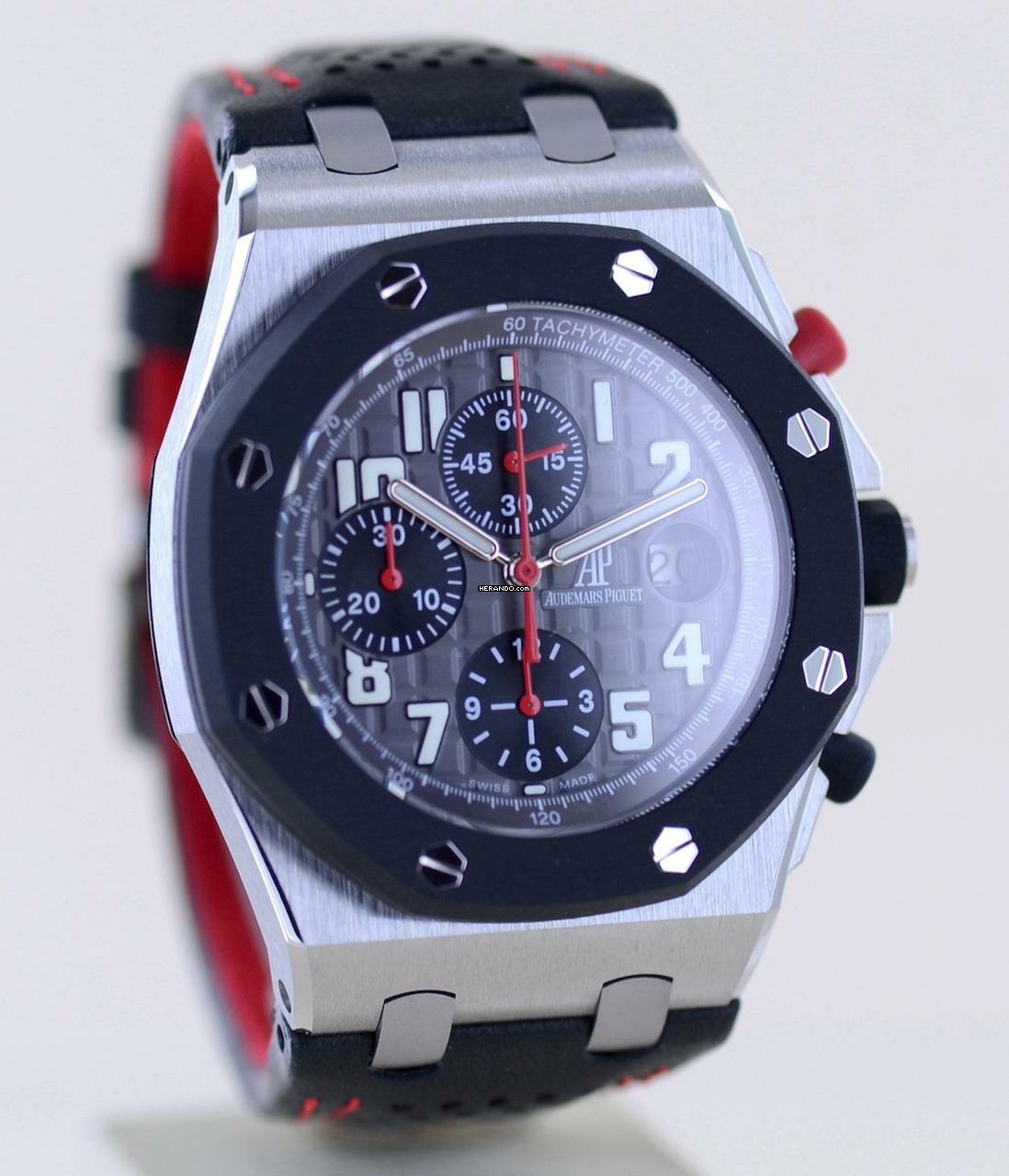 Das graue Zifferblatt mit Mega Tapisserie-Verzierung und den drei schwarzen Totalisatoren fällt bei dieser schönen Uhr sofort auf. Die in Weißgold gefassten Ziffern und Zeiger harmonieren perfekt mit den weißgoldenen Schrauben auf der markanten schwarzen Kautschuklünette. Dieser Offshore Chronograph aus dem Hause Audemars Piguet kommt am neuen schwarz-roten Lederband und setzt Maßstäbe. Mit dem modernen Zifferblatt und im sportlich zeitlosen Titangehäuse punktet er optisch und überzeugt zudem technisch mit zahlreichen Funktionen.Dieses Sondermodell wurde in 2009 in einer kleinen Stückzahl von nur 50 Exemplaren aufgelegt. Entsprechend selten ist eine derartige Offshore in freier Wildbahn zu sehen. Der Preis lag bei 39.950 Euro und war damals schon sündhaft teuer.