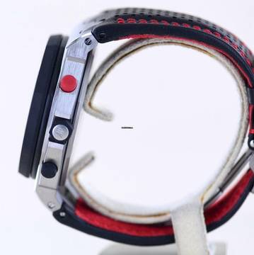 Die Chronographendrücker und die Krone sind rechts am Gehäuse markant in rot und schwarz gehalten. Passend dazu geben die schwarzen Totalisatoren mit roten Zeigern die Stoppzeiten an: Die Stoppminute auf neun Uhr, die Stoppstunde auf sechs Uhr, die Stoppsekunde läuft mit rotem Zeiger zentral. Die kleine Sekunde läuft bei 12 Uhr. Auf drei Uhr liegt das runde Datumsfenster - im umrandeten "Bullauge" zeigt sich das Datum viereckig auf weißem Grund. Ein pfiffiges Feature! Außen am Zifferblatt ist die Tachymeterskalierung angegeben.