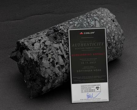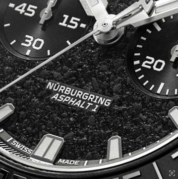 ZIFFERBLATT: Das weltweit erste Zifferblatt aus Rennstrecken-Asphalt. Original Nürburgring-Asphalt wurde bei Restaurierungsarbeiten am 18. November 2021 entnommen und mit einem speziellen Verfahren als Zifferblatt verarbeitet.