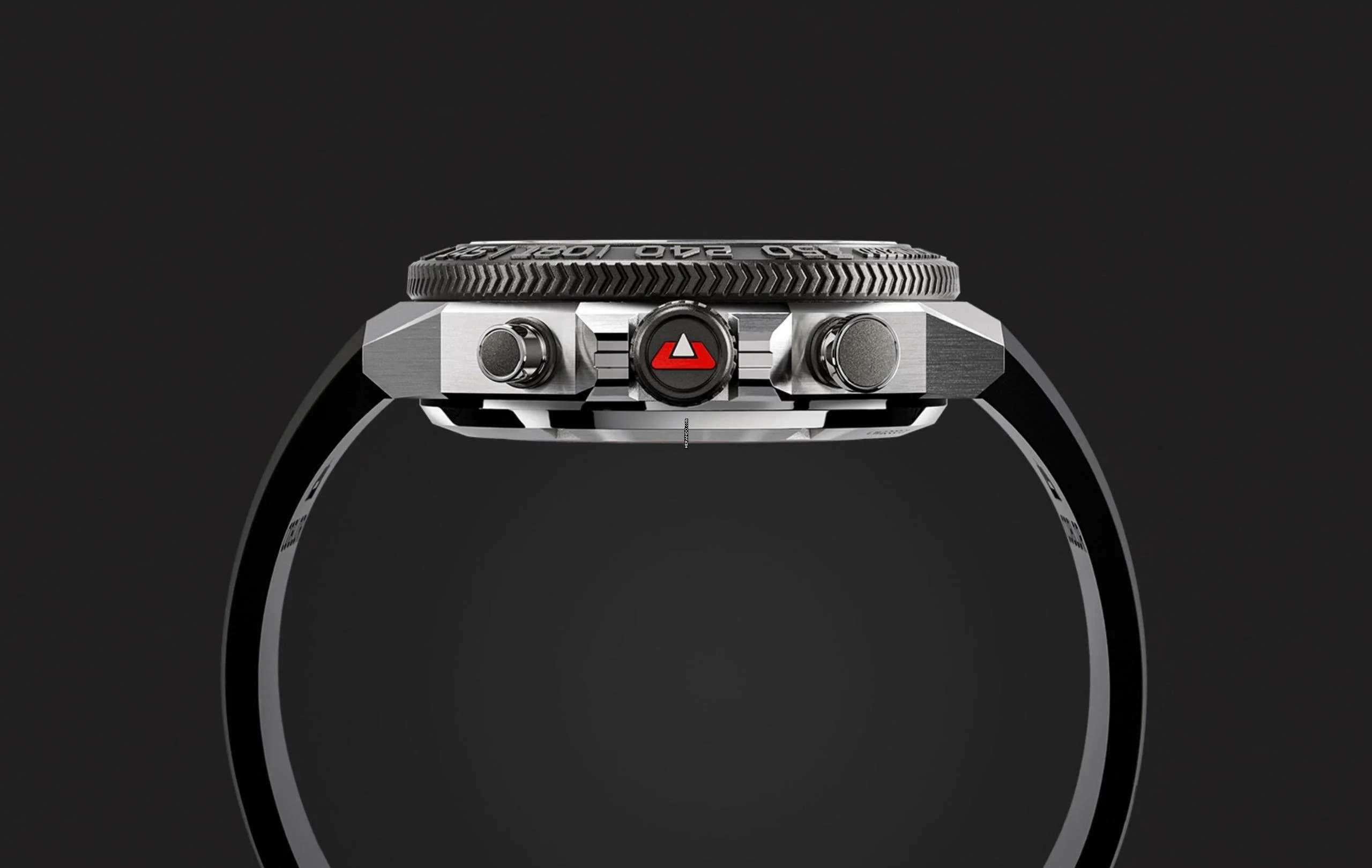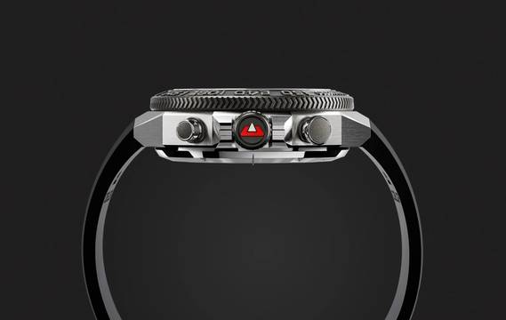 Krone zum Aktivieren der Aufzugsspindel in zwei Positionen: 1) Betriebs- und Handaufzug-Position (44 Umdrehungen zum vollständigen Aufziehen). 2) Zeiteinstellung mit Sekundenstopp. Drücker zur Aktivierung des Chronographen (Start-Stopp) bei 2 Uhr und Drücker zum Zurücksetzen auf Null bei 4 Uhr.