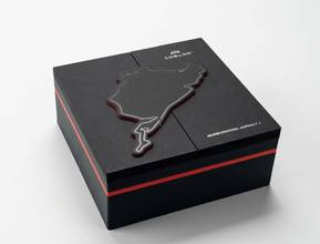 ROTOR: Spezial-Rotor hat die Form der Nürburgring Rennstrecke, ein Rubin zeigt die Stelle (Döttinger Höhe, Tiergarten), wo der fast 100-jährige Asphalt entnommen wurde, 100% in der Schweiz hergestellt.