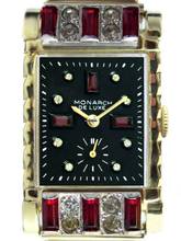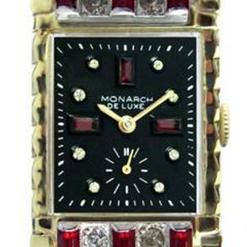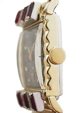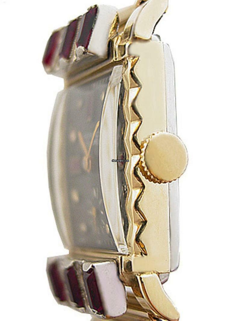 Zifferblatt: schwarzes Original Zifferblatt besetzt mit 3 roten und 8 weissen Strasssteinen, Hilfssekunde, goldene Index - Zeiger