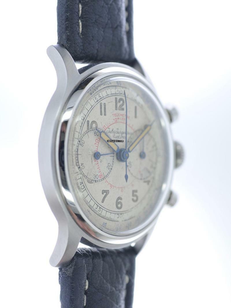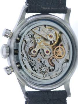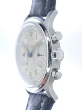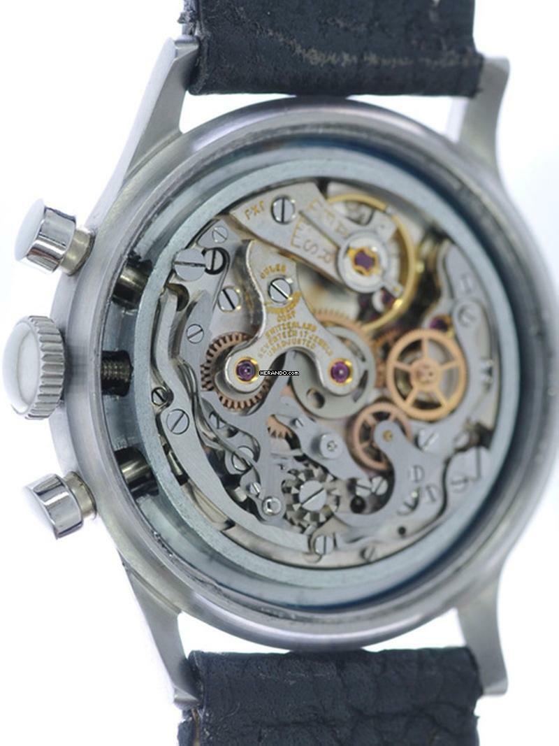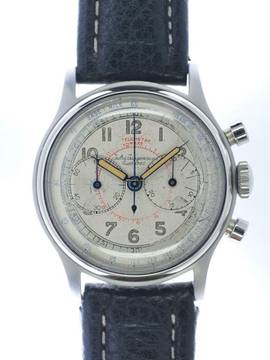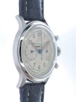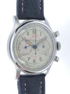 Zifferblatt: versilbertes Originalzifferblatt, 30 - Minuten - Register, arabische Leuchtziffern, außen blaue Tachymeter - und innen rote Telemeter - Skala, gebläute Stahl-Leuchtzeiger