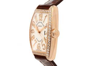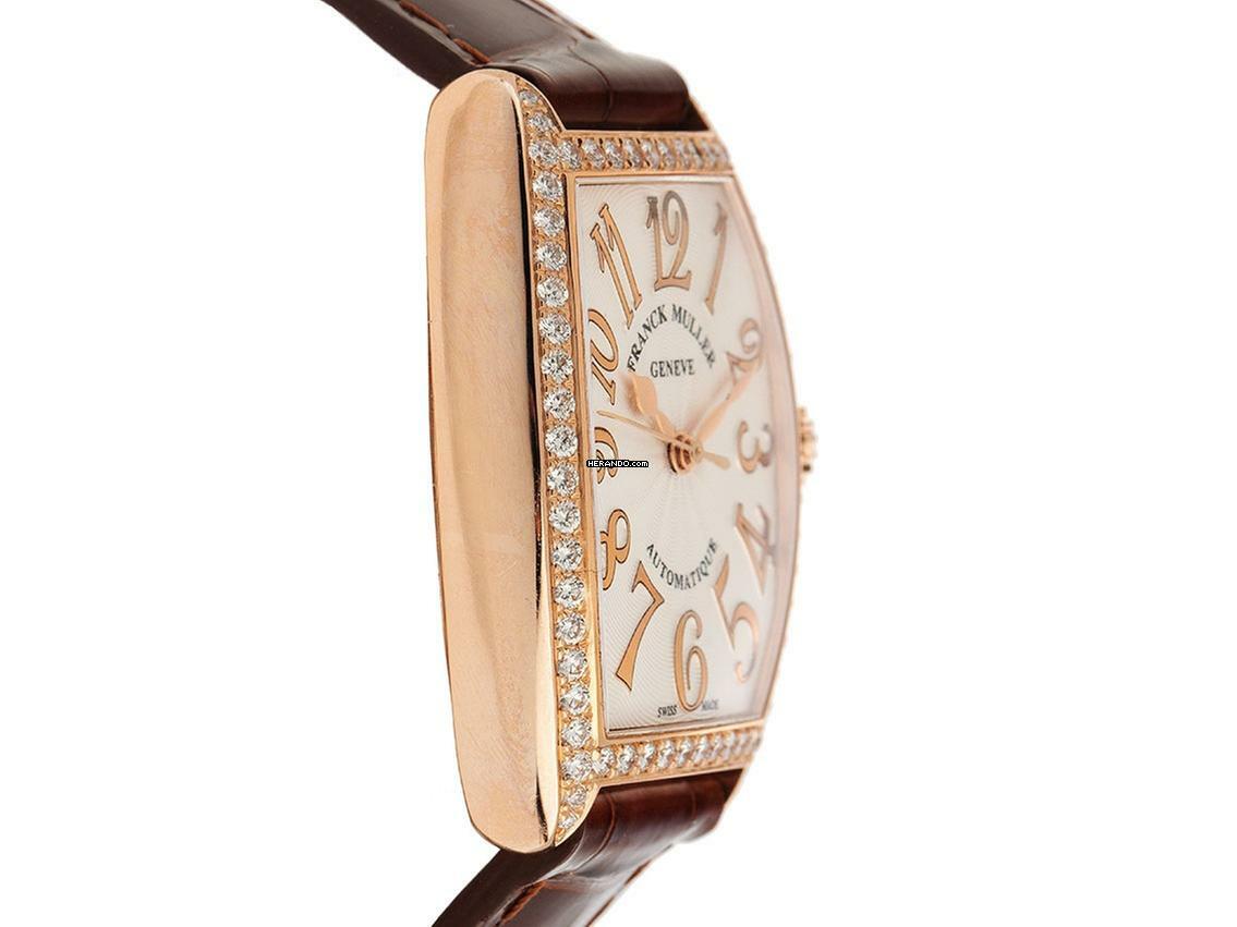 Franck Muller Cintrée Curvex 18kt Roségold Diamanten Automatik Armband Leder Gehäuse 18kt Roségold poliert, tonneauförmig, Gehäusemaße ohne Krone (LxBxH) 35x25x10mm. Lünette 18kt Roségold mit Diamanten besetzt. Armband Leder braun mit Ziernaht, Anstoßbreite 16mm, Franck Muller Stiftschließe 18kt Roségold mit Diamanten besetzt. Zifferblatt silberfarben mit "Fliquet"-Effekt, roségoldenen arabischen Ziffern und roségoldenen Zeigern. Uhrwerk Automatik. Anzeige von Stunde, Minute und Sekunde über Zeiger aus der Mitte mit Sekundenstopp zur sekundengenauen Einstellung der Uhrzeit. Saphirglas kratzfest, gewölbt. Krone geriffelt mit Hersteller-Logo. Boden 18kt Roségold 4-fach verschraubt und graviert mit Saphirglas Sichtfenster. Gewicht der Uhr inklusive Armband 54g. Referenznummer: 7500 SC AT FO REL D 1 5N, ID: ST3172196600520H-15900, Artikelnummer: 10000052683. Original Franck Muller Box mit Umkarton und Garantie Papiere, Full Set. Neu. Lieferzeit sofort.
