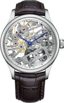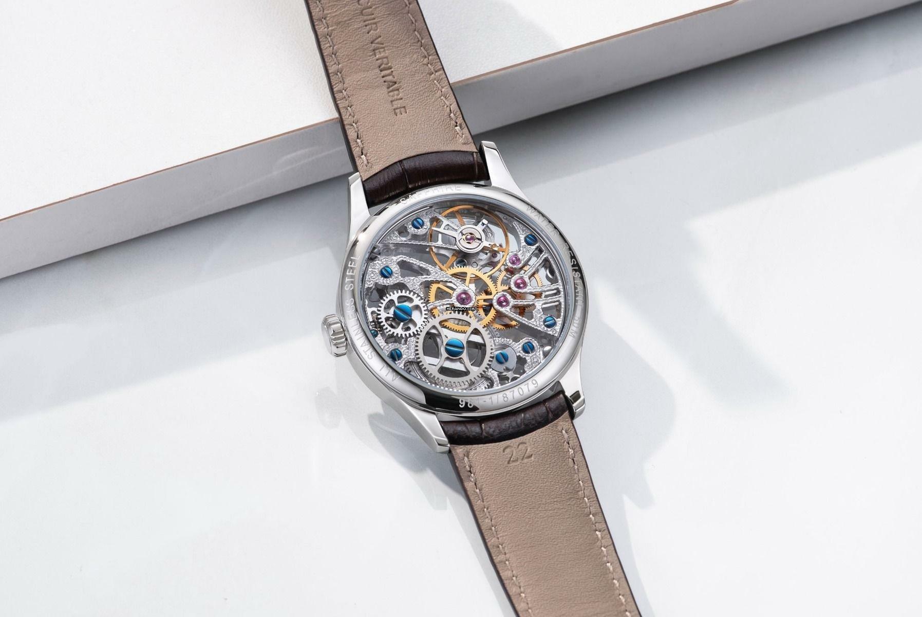 Gehäuse Satinierter Stahl, gewölbtes, entspiegeltes Saphirglas, transparenter Gehäuseboden