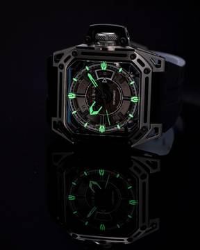 - Außenskelett aus Rotgussstahl & Gehäusekern aus schwarzem Stahl.