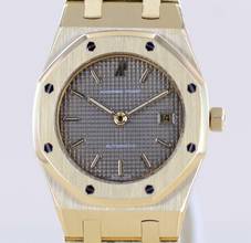Die "Royal Oak" (benannt nach einem berühmten Segelschiff der Britischen Flotte) trug wesentlich zum Erfolg und zur Bekanntheit der Marke Audemars Piguet bei und kann inzwischen, ähnlich wie die Oyster-Modelle von Rolex, zu den Produkt-Ikonen der Neuzeit gezählt werden. Charakteristisch für diese von Gérald Genta gestaltete Uhr, die 1972 als „erste Luxus-Sportuhr der Welt“ auf den Markt gebracht wurde, ist das sichtbar mit Weißgoldschrauben verschraubte, achteckige Gehäuse und das darin integrierte Goldband, welches durch höchsten Tragekomfort überzeugt. Das feingliedrige Band erzeugt außerdem eine sehr schöne Reflektion am Arm.Die hier angebotene Royal Oak ist eine schöne Zweizeiger im sportlich luxuriösen Gelbgoldgehäuse im Bestzustand. Das graue guillochierte Blatt ist ein zeitloser Traum und wirkt unter dem Saphirglas hervorragend. Das Datum intergiert sich klassisch auf 3 Uhr. Die Lünette dieser Royal Oak ist aus massivem Gelbgold. Ein luxuriöser Auftritt, der perfekt mit dem kantigen Band und dem grauen Blatt harmoniert. Aufgrund der geschliffenen Oberfläche entsteht eine wunderbare Reflexion am Handgelenk, die nur eine Royal Oak so erzeugen kann.