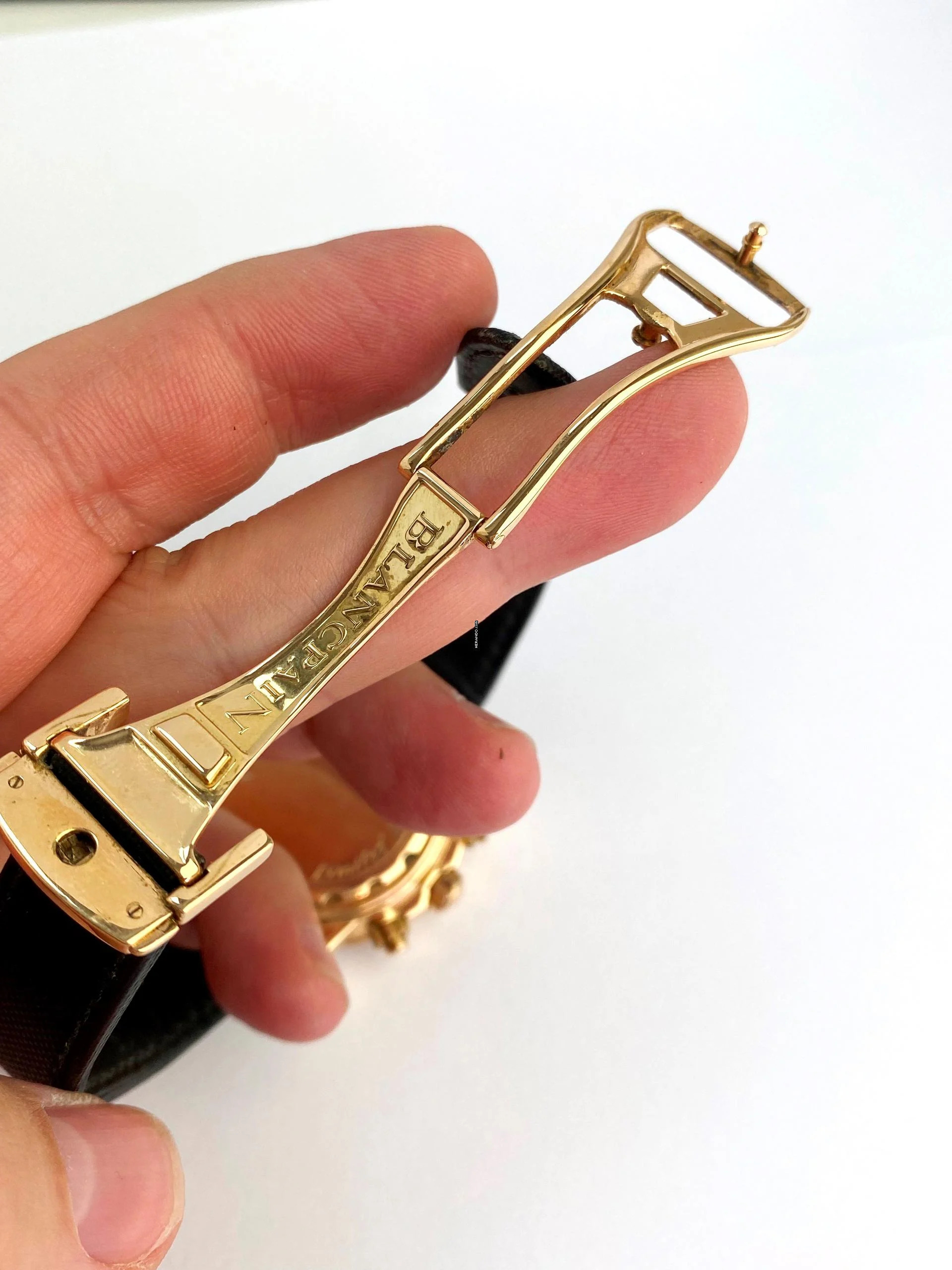Full Set, Box and Original Papers available. Also a service invoice from summer 2018, carried out directly at Blancpain, price 1229 Euro. The weight of the watch head only (without strap) is 107g. The watch comes with two straps black and brown. The black strap has its original Blanpain Folding clasp in Rose Gold. The brown strap has a generic rose plated pin buckle. Everything that can be seen in the photos is included in the scope of delivery.