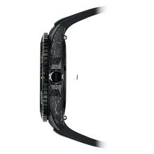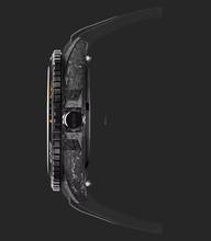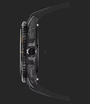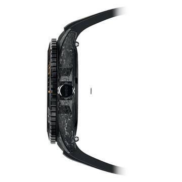 Die mit einem Keramikring verzierte Lünette ist mit Super-Luminova Grade X gefüllt, das Gehäuse in ein ausdrucksstarkes Carbon Material gehüllt.