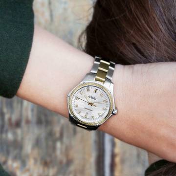EBEL Discovery Damenuhr, Gehäuse aus Edelstahl und 18K Gelbgold mit 69 Diamanten (0.2691 ct.), Ø 33 mm, weißes Perlmuttzifferblatt mit 11 Diamanten (0.0715 ct.), innenseitig entspiegeltes Saphirglas, Armband aus Edelstahl mit 3N gelbvergoldeten Gliedern, Schweizer Quarzwerk, wasserdicht bis 10 bar.