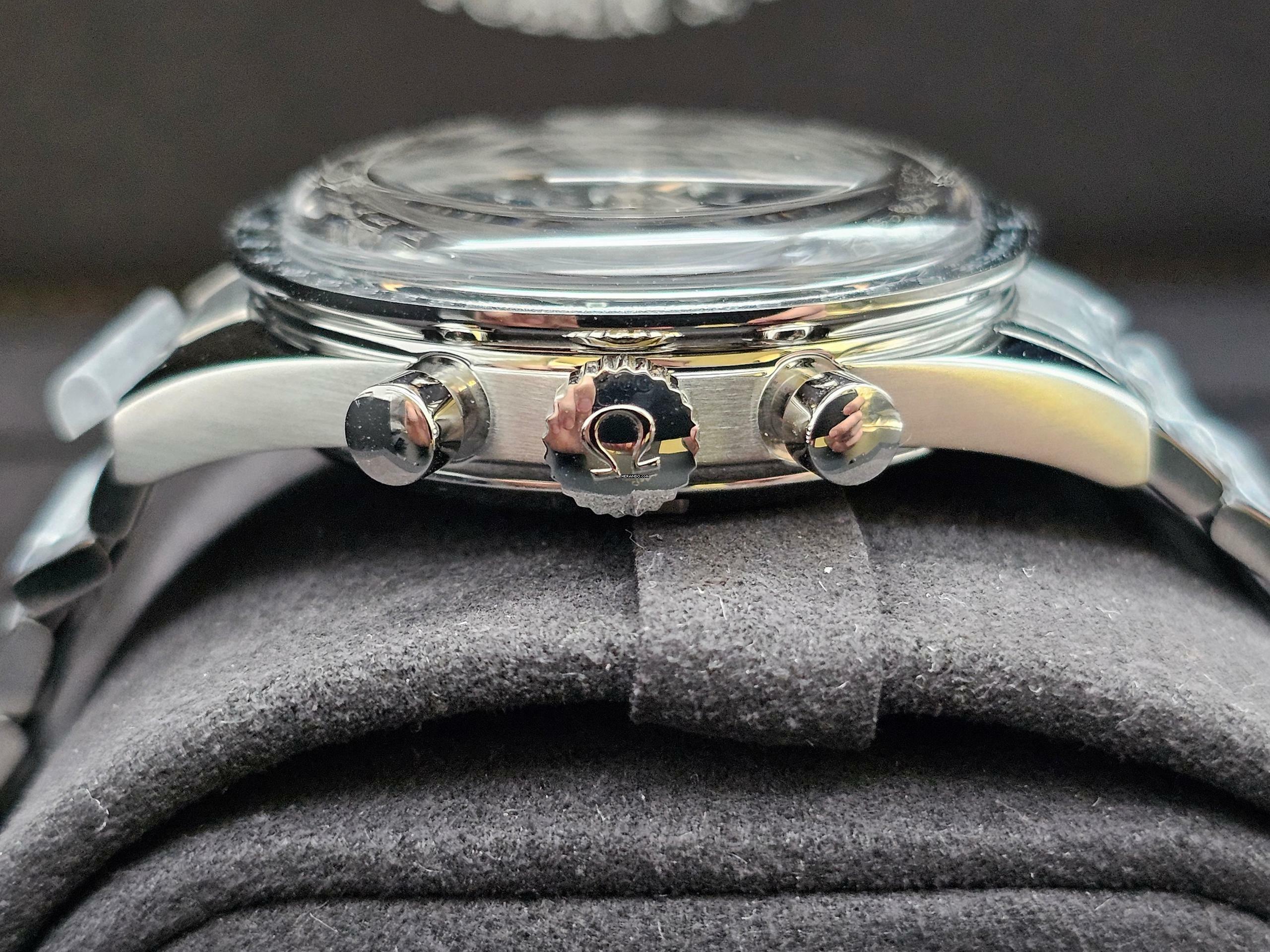 The 39.70 mm case is crafted in polished and brushed stainless steel and features a “flat links” bracelet with OMEGA’s patented comfort release adjustment system. The bezel ring is presented in black aluminium and includes the legendary tachymeter scale with an emblematic “Dot Over Ninety”.