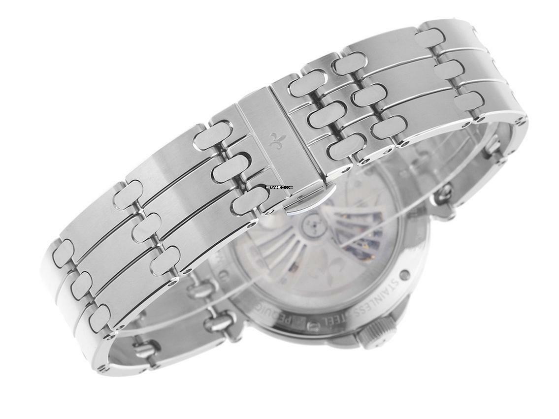 Pequignet Montre Moorea Stahl Automatik Armband Stahl Gehäuse Edelstahl poliert und satiniert, Gehäusedurchmesser ohne Krone 38,5mm, Gehäusehöhe 9,4mm. Lünette Edelstahl glatt und poliert. Armband Edelstahl poliert und satiniert, verdeckte Doppelsicherheitsfaltschließe Edelstahl mit Hersteller-Logo. Zifferblatt opalweiß mit aufgesetzten Edelstahl Indexen und Edelstahl Leuchtzeigern. Uhrwerk Automatik, Calibre Initial mit 21 Edelsteinen, Gangreserve ca. 65 Stunden. Anzeige von Stunde, Minute und Sekunde über Zeiger aus der Mitte mit Sekundenstopp zur sekundengenauen Einstellung der Uhrzeit, Datumsanzeige mit Schnellverstellung bei 6 Uhr. Saphirglas kratzfest. Krone verschraubbar mit Flankenschutz und Hersteller-Logo. Boden Edelstahl 6-fach verschraubt und graviert mit Saphirglas Sichtfenster. Gewicht der Uhr inklusive Armband 134g, Länge des Armbandes inklusive Gehäuse 195mm. Wasserdicht bis 10 ATM. Referenznummer: 4240313, Gehäusenummer: 0XXX, ID: ST506439001024H-3900, Artikelnummer: 10000076687. Original Pequignet Box mit Umkarton und Garantie Papiere sowie Beschreibung, Full Set. Neu. Neuheit. Lieferzeit sofort.