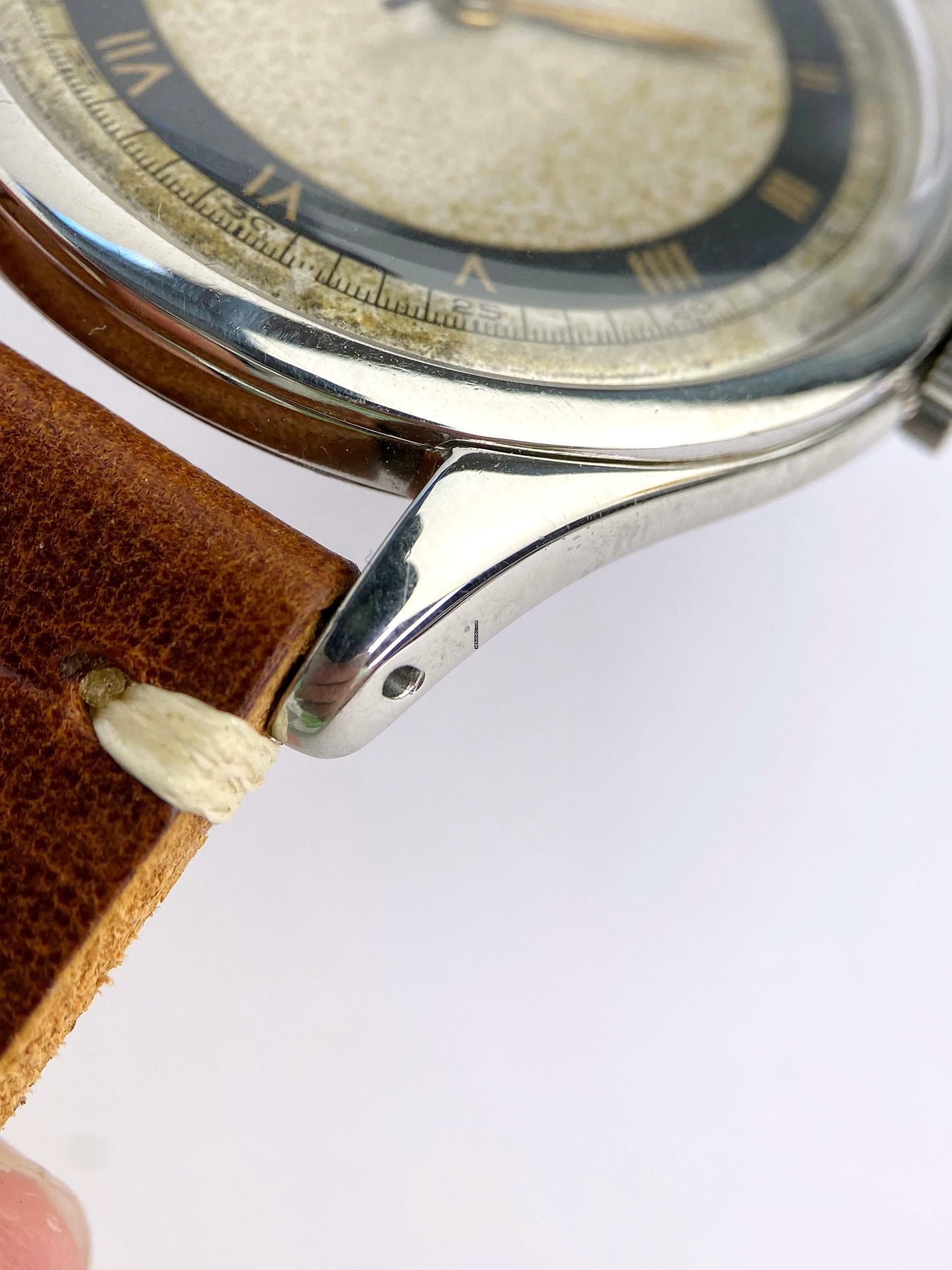 - The still FACTORY ORIGINAL (non-refurbished) dial has some patina matching its age.