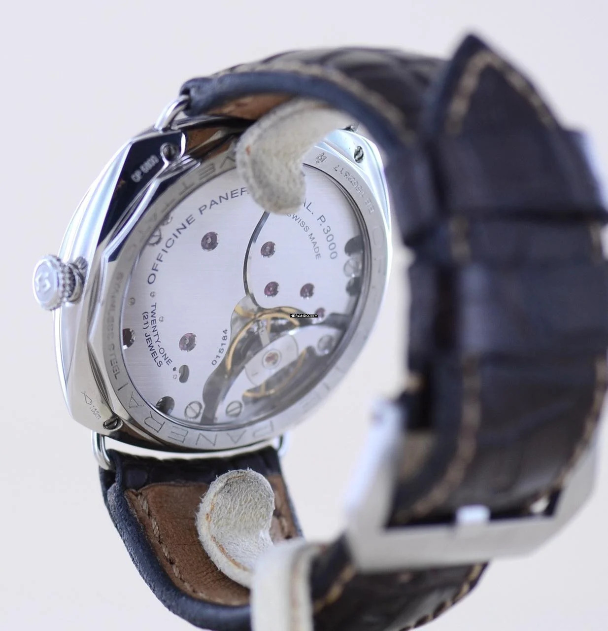 Das Panerai P3000 Manufakturkaliber ist durch den Saphirglasboden zu betrachten und ist ein echter Augenschmaus. Die beeindruckenden 72 Stunden Gangreserve machen es zu einem spannenden Handaufzugwerk. Schade, dass dieses Modell aus der Special Edition auf nur 750 Stück limitiert wurde.