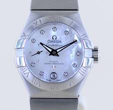 Sehr schöne Omega Constellation Lady in der schönen neuen 27mm Version. Klassische elegante Formen, die bei Omega lange Tradition haben, vereint mit zuverlässiger Technik. Das Zifferblatt ist genial verarbeitet und hat eine einzigartig schöne Perlmuttoberfläche, die je nach Blickwinkel unterschiedlich wirkt. Die Brillantindizes, die feine Sekunde und das Datum auf 6 Uhr sorgen für eine symmetrische Erscheinung in luxuriöser Perlmuttumgebung. Eine elegante Komposition. Zeiger und Indizes sind aus 18K Weißgold und harmonieren genial mit der Perlmuttoberfläche sowie dem Edelstahlgehäuse.Die Constellation eignet sich hervorragend für Business und Freizeit, da sie Sportlichkeit und Eleganz vereint. Dennoch hat sie bei Kennern einen sehr hohen Wiedererkennungswert und hält schon seit Jahren ihren Wert bzw. steigert diesen sogar. Bei guter Pflege hält sie ein Leben lang. Insbesondere das neue Gehäuse und Band müssen lobend erwähnt werden. Omega hat das Band stetig weiterentwickelt und liefert ein perfektes Ergebnis. Tragekomfort und Langlebigkeit der Geometrie sind perfekt.