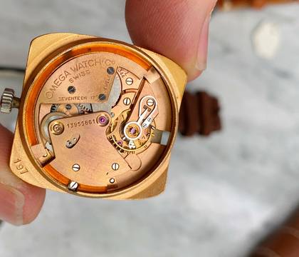 - Genuine Omega Glas displaying a tiny Omega Logo in its centre