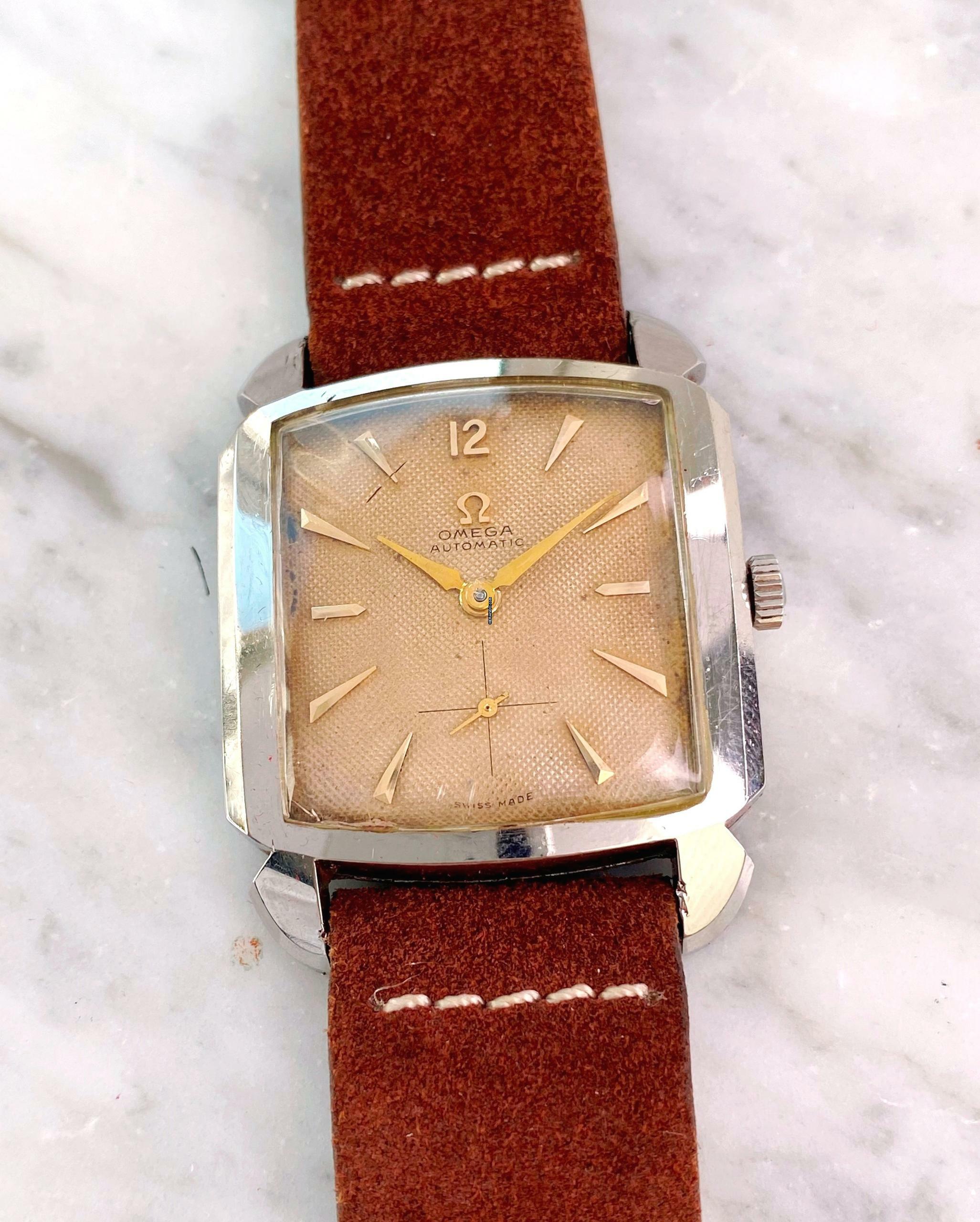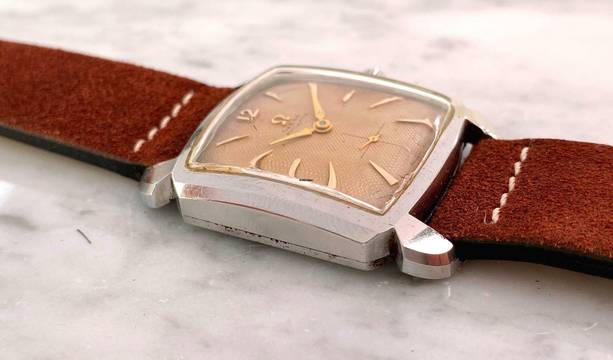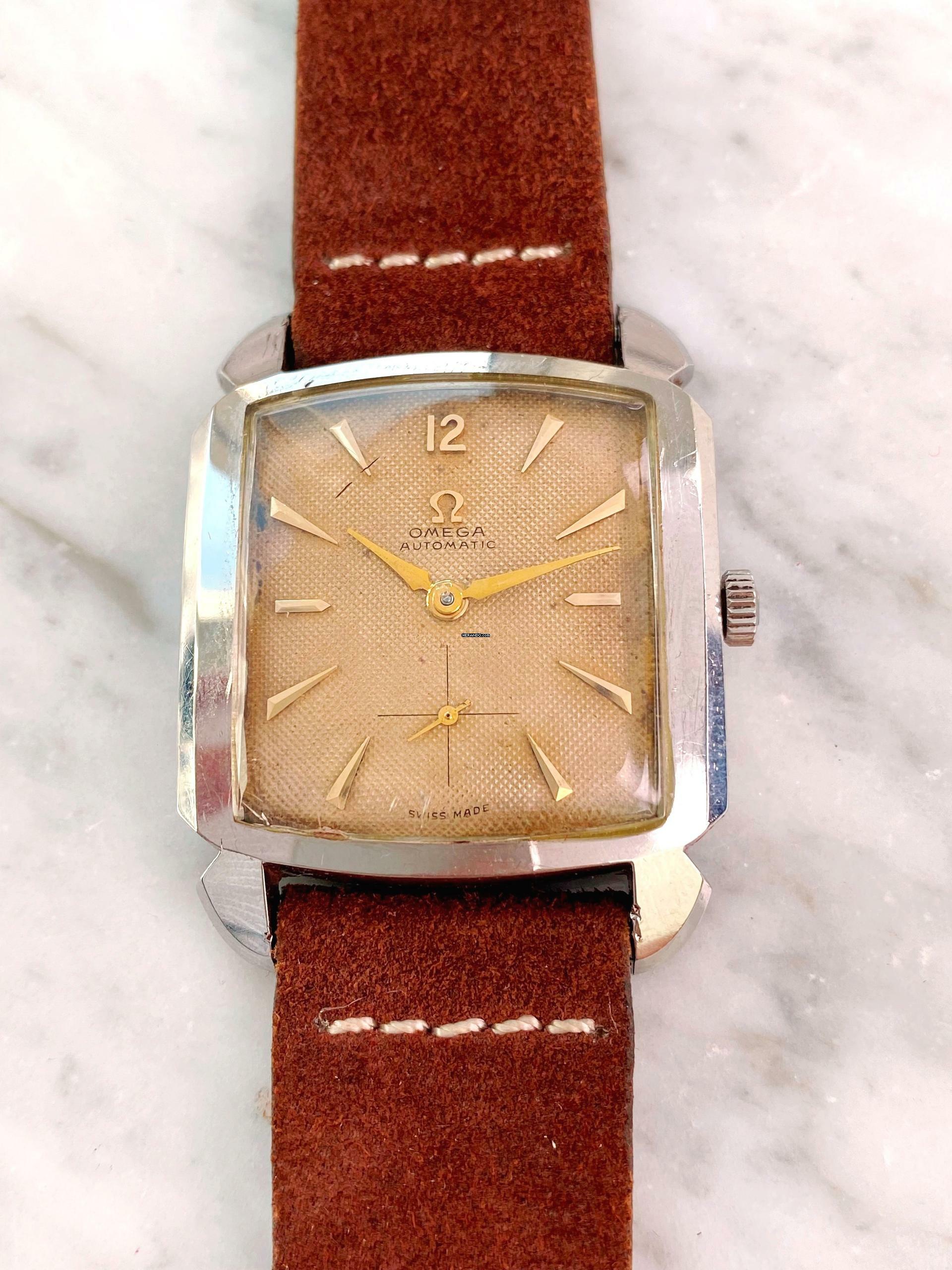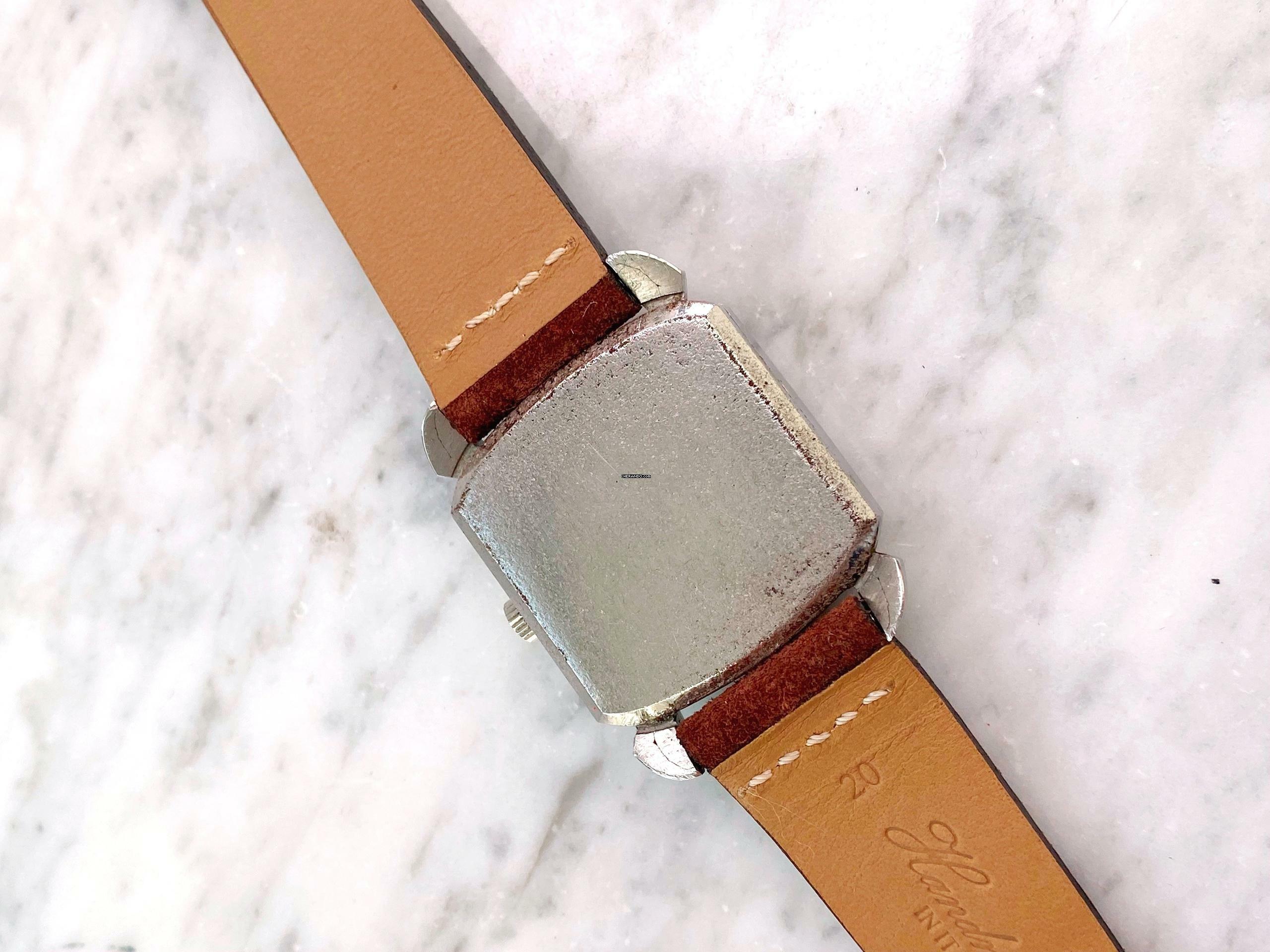 Dimensions: 31 x 41mm. very rare and big watch with a cream coloured dial that now has a lovely patina that ranges from cream to ecru to pink to golden brown depending on the light and angle of the watch.