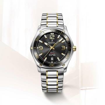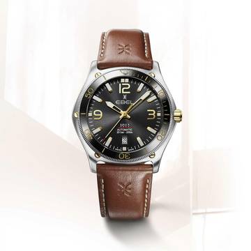 Herrenuhr EBEL 1911, Edelstahlgehäuse und 18K Gelbgoldkronen- und Lünettenschrauben, unidirektionale drehbare Lünette mit schwarzem Keramikring, Ø 42mm, schwarzes galvanisches Zifferblatt mit arabischen Ziffern und aufgebrachten Indizes mit Super-LumiNova, Datumsfenster bei 6:00 Uhr, Saphirglas mit Antireflexbeschichtung darunter, Gehäuserückseiten aus Saphirglas, zweifarbiges Edelstahl-Gliederarmband, Faltschließe, kommt mit zusätzlichem braunem Wadenarmband, Schweizer Automatikwerk, wasserdicht bis zu 20 bar.
