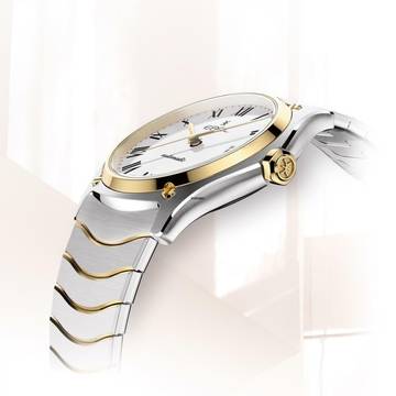 EBEL Sport Classic Herrenuhr, Gehäuse aus Edelstahl mit Lünette, Schrauben und Krone aus 18K Gelbgold, Ø 40 mm, weißes Zifferblatt mit schwarzen römischen Ziffern, innenseitig entspiegeltes Saphirglas, Wellengliederarmband aus Bicolor-Edelstahl mit Faltschließe, Schweizer Automatikwerk, wasserdicht bis 5 bar.