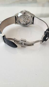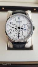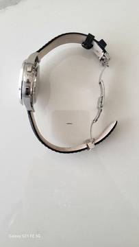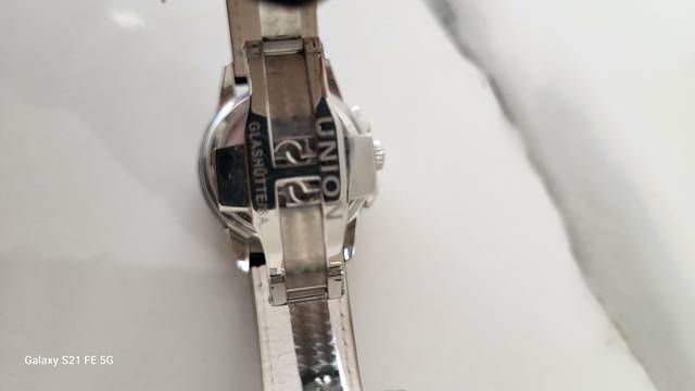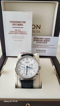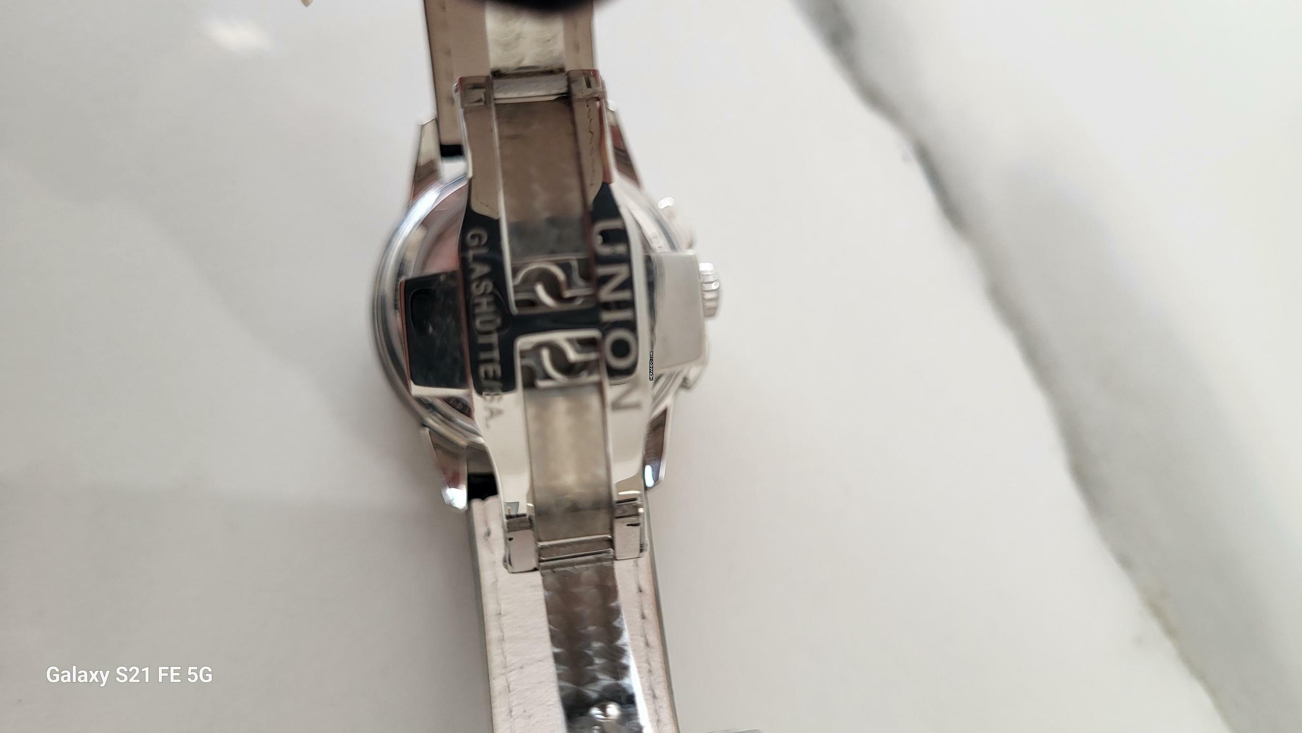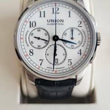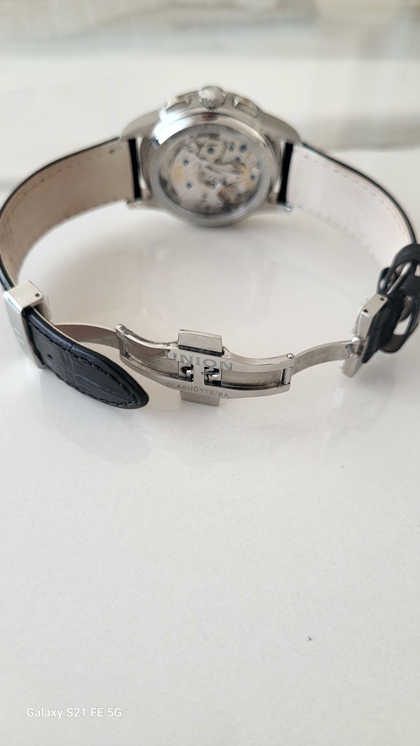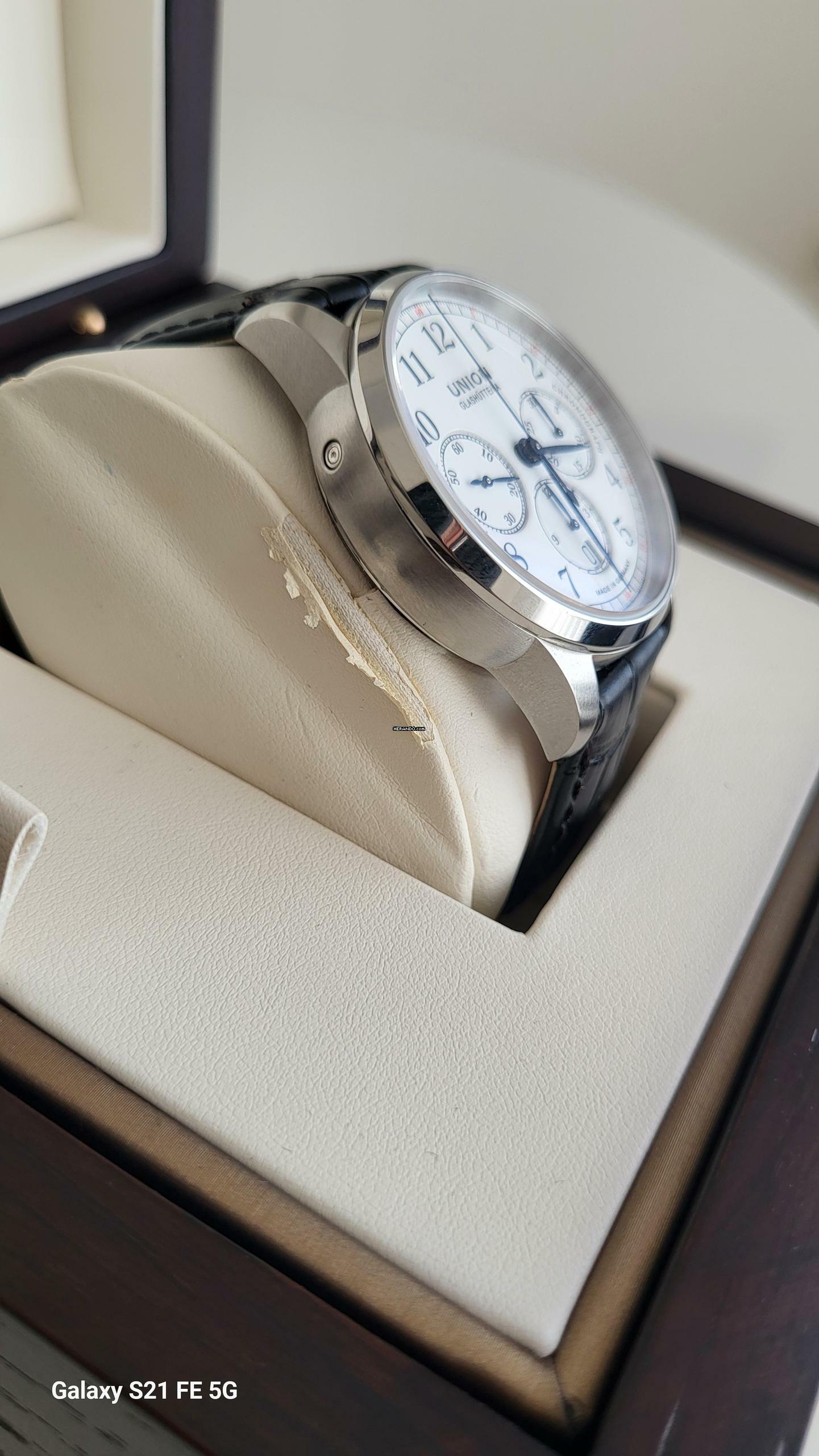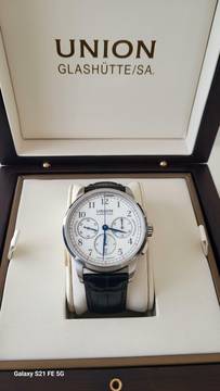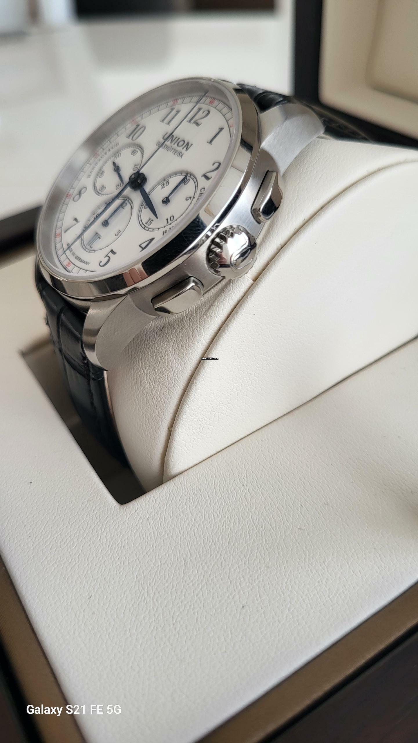 Zum Verkauf bieten wir eine elegante Herrenarmbanduhr von Union Glashütte an. Gehäuse, Lünette und Faltschließe aus Edelstahl. Schwarzes Lederarmband. Armband lange Seite ca. 113mm, kurze Seite ca. 80mm. Weißes Zifferblatt mit arabischen Zahlen. Blaue Zeiger. Wasserdicht 10 bar. Handaufzug. Die Uhr ist mit original Papiere und Box erhältlich.