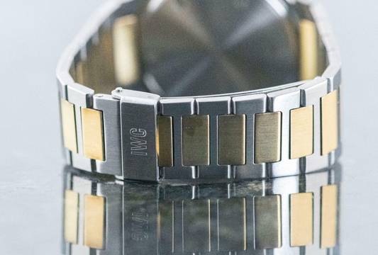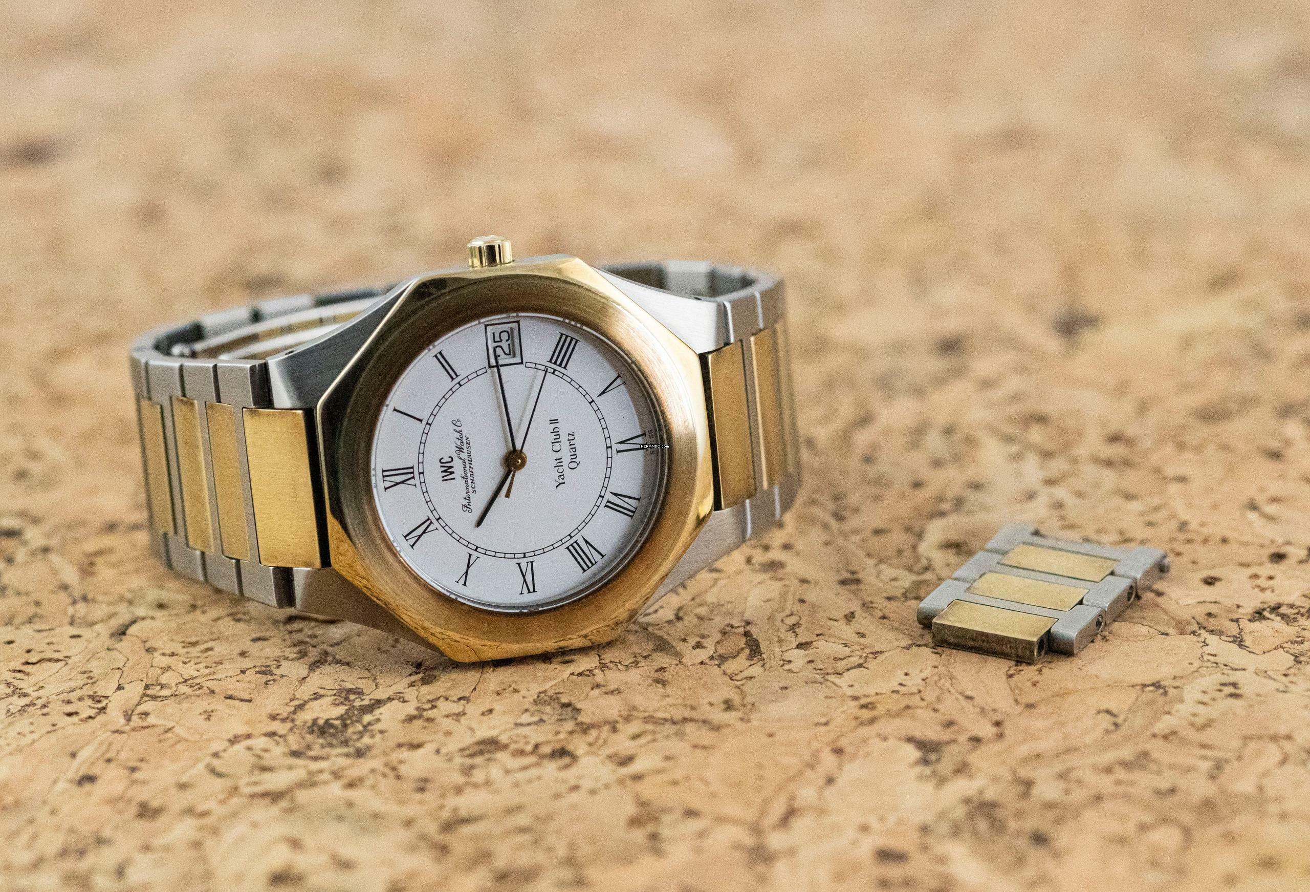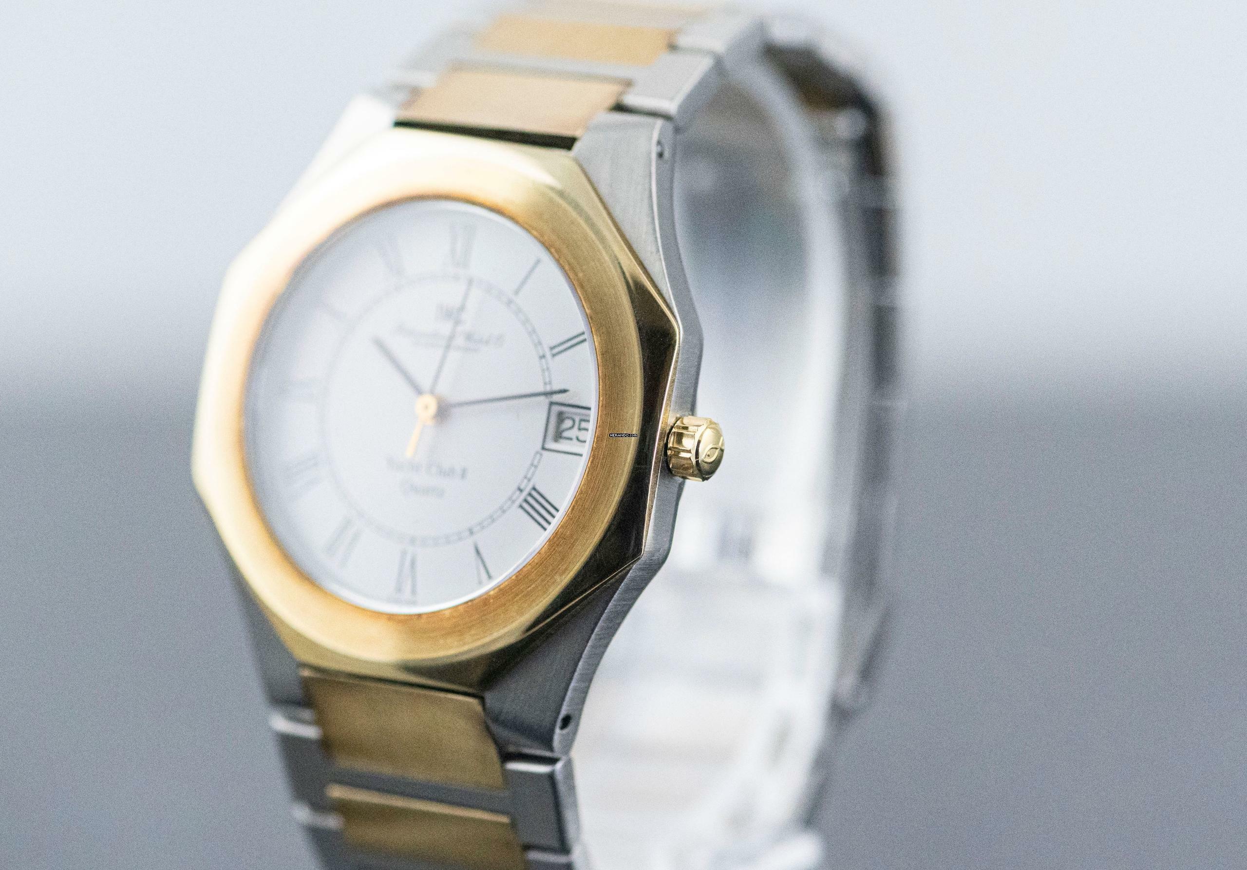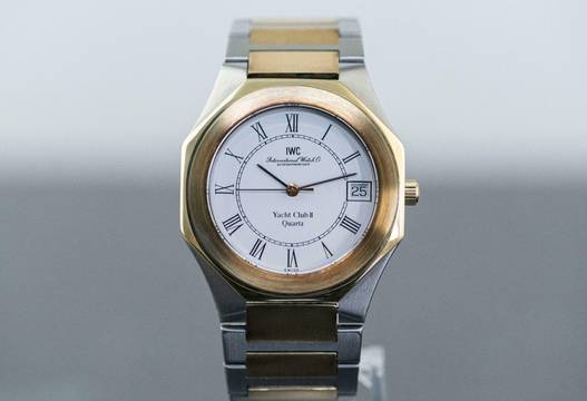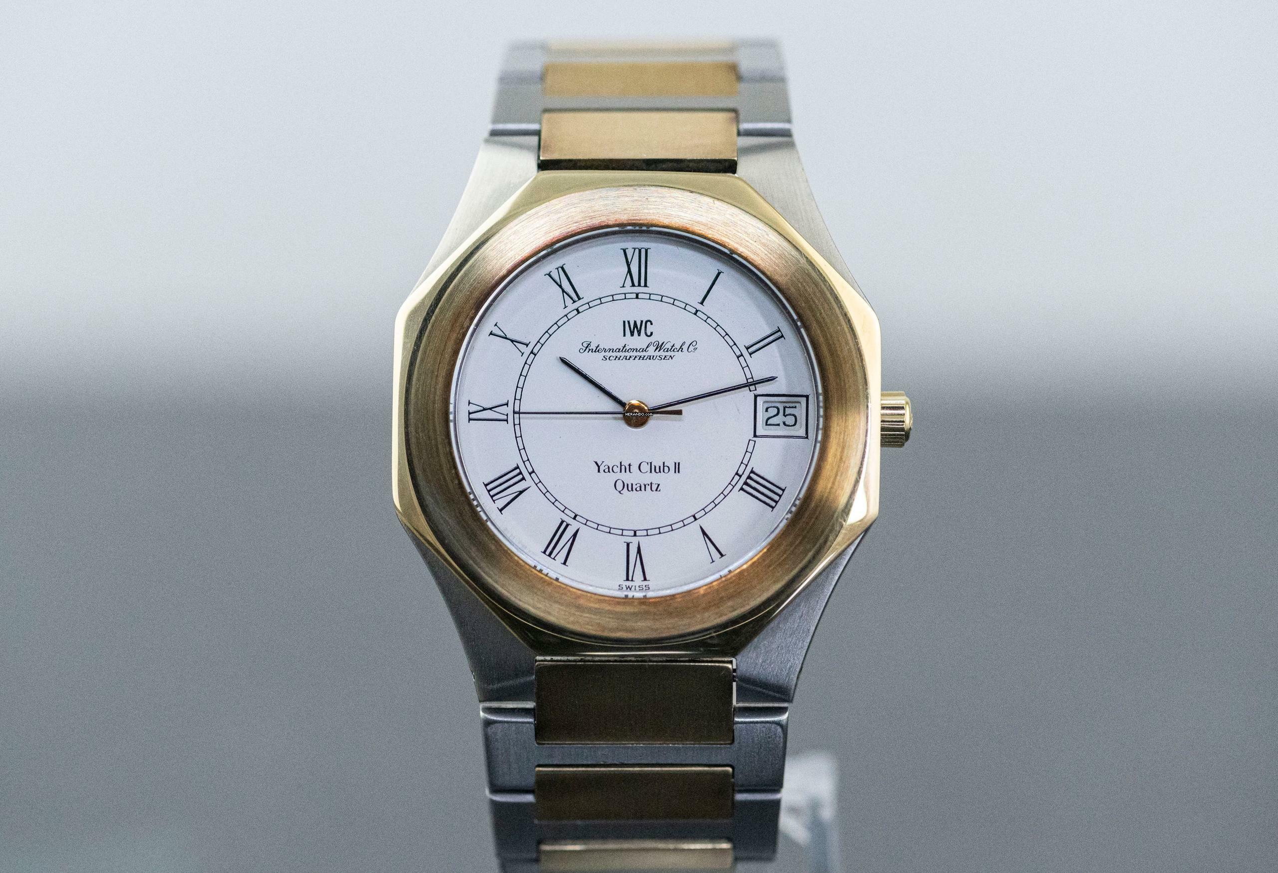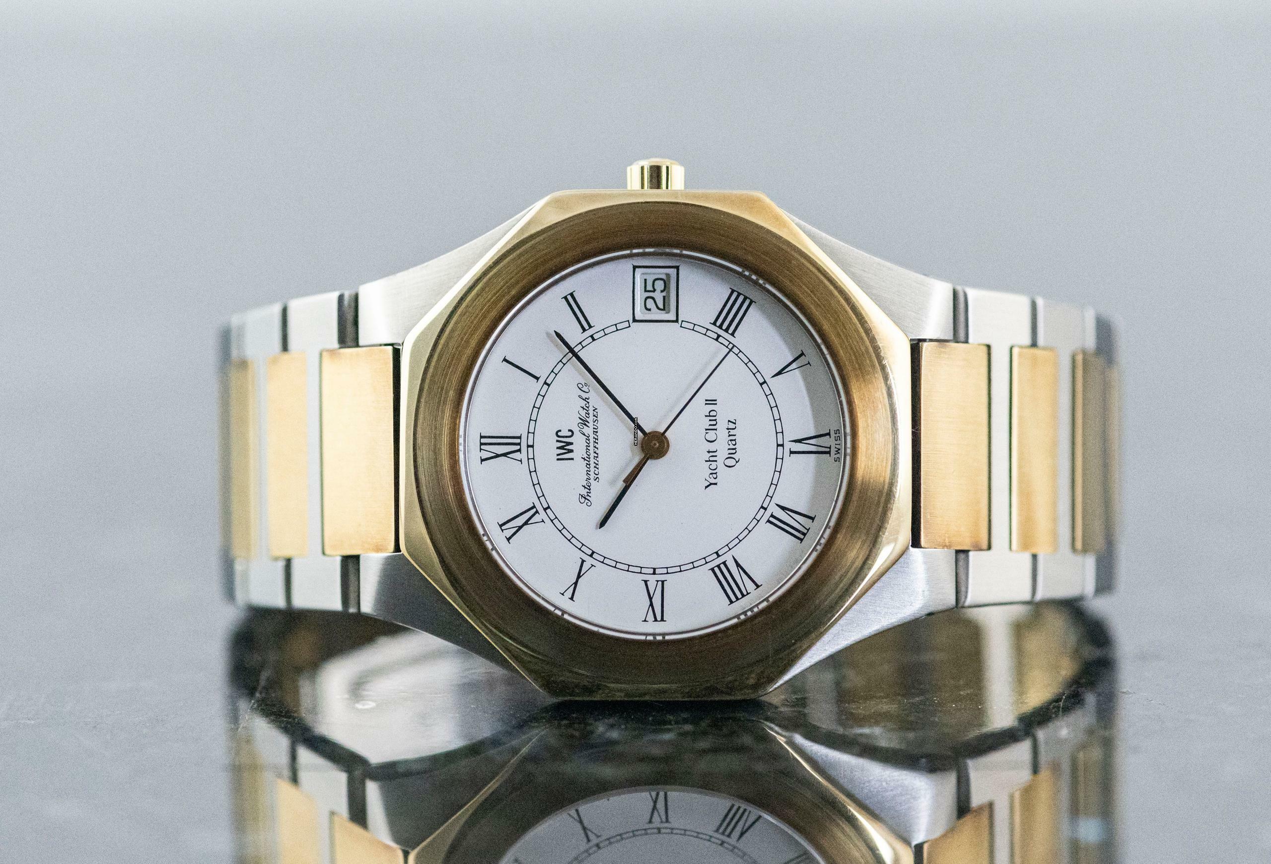 Rare Vintage iwc Schaffhausen Yacht Club ii | Referenz 3311 | in Stahl & Gelbgold | Quarz Kaliber 2250 | Gehäusenummer / Seriennummer 2.282.xxx | Uhr stammt aus der Zeit um 1981 / 1982 | Durchmesser 34 mm | perfekte 'mid size' Version für Damen und Herren | Gerald Genta Kreation | weißes Zifferblatt mit römischen Indizes | Gelbgold der Lünette und der Zwischenbandelemente hat im Laufe der Jahrzehnte eine schöne Oxidation angenommen | drei zusätzliche Ersatzelemente, wenn diese am Armband montiert sind, beträgt der Innenumfang des Armbandes ca. 18,8 cm | Gesamtgewicht ca. 106,5 Gramm | sehr guter Zustand mit altersüblichen Gebrauchsspuren.