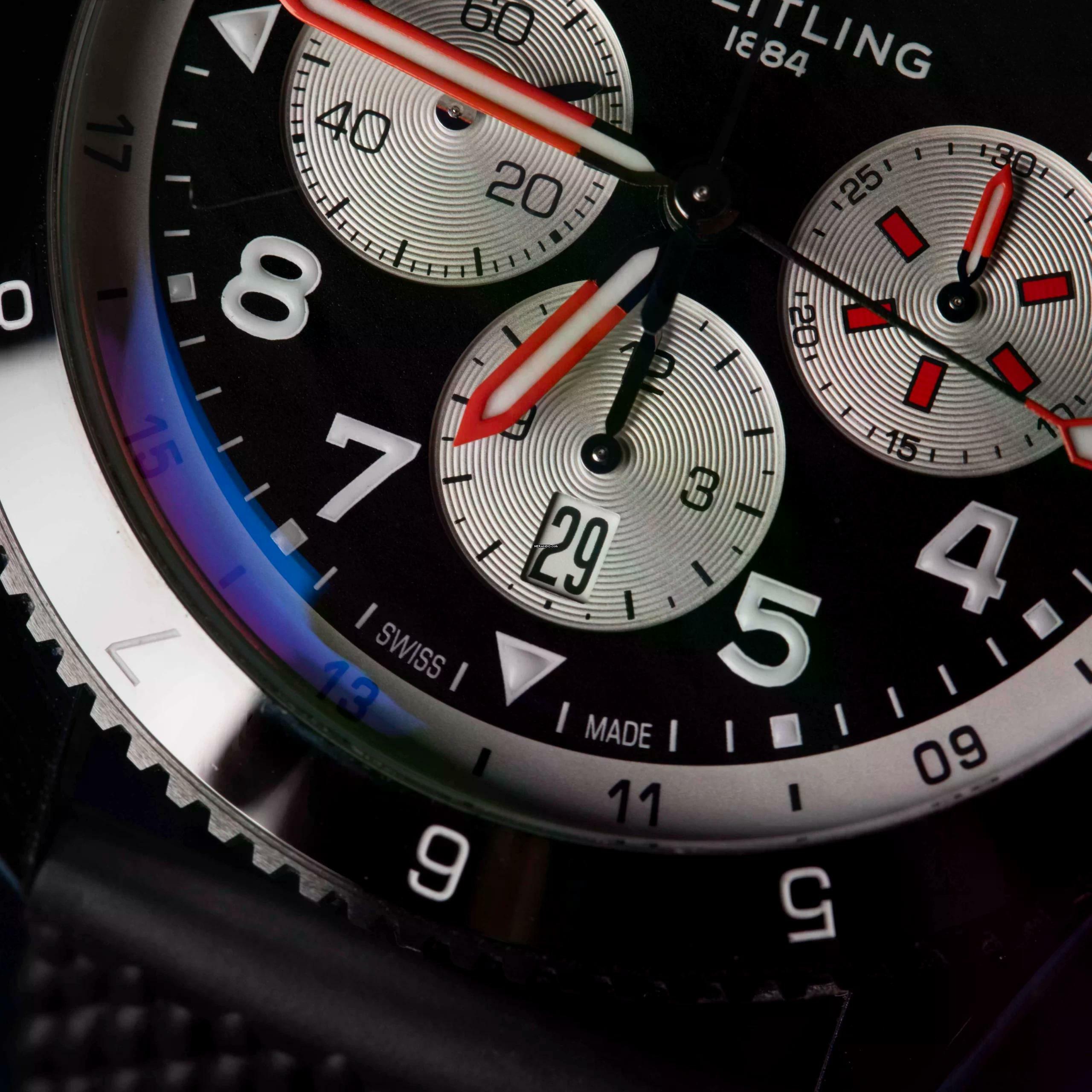 Breitling Super Avi B04 Chronograph 46 Mosquito - von den ersten mutigen Starts bis zur Geburtsstunde des kommerziellen Flugverkehrs ist die Geschichte von Breitling untrennbar mit der des Flugs verbunden. In den 1930er Jahren machte sich die Breitling-Abteilung Huit Aviation einen Namen mit der Erfindung von Präzisions-Cockpituhren. Zwei Jahrzehnte später stellte sie ein weiteres neuartiges Fluginstrument vor, diesmal in tragbarer Form: die Ref. 765 avi. Diese bahnbrechende Fliegeruhr bildete den technischen Hintergrund für die heutige Super avi, eine Kollektion, die vom robusten Geist der berühmten frühen Flugzeuge inspiriert ist. Die Super avi Mosquito ehrt eine dieser Legenden. In einer Zeit, in der Aluminium und Stahl Mangelware waren, nutzten die Ingenieure der de Havilland Mosquito ein Material, das noch immer reichlich vorhanden war: Holz. Das "hölzerne Wunder" sorgte für Furore, als es seine Metallkollegen übertraf und zu einem der schnellsten Flugzeuge wurde, die zwischen 1940 und 1950 gebaut wurden. Dank seiner überragenden Manövrierfähigkeit konnte es die unterschiedlichsten Aufgaben übernehmen: als leichter Bomber, Nachtjäger, Transportflugzeug und fotografischer Aufklärer. Die Super avi Mosquito ist eine echte Fliegeruhr, die den Strapazen eines historischen Cockpits standhält. Sie verfügt über große, gut lesbare arabische Ziffern auf dem Zifferblatt und der Lünette. Die übergroße Krone und die gerändelte Lünette des robusten 46-mm-Gehäuses sorgen für optimale Griffigkeit, selbst in den behandschuhten Händen eines Piloten. Die gesteppten Kalbslederarmbänder sind eine Anspielung auf die Nähte der klassischen Flugausrüstung, während das optionale Edelstahlarmband eine elegante Alternative darstellt. Piloten und andere Reisende werden die Möglichkeit zu schätzen wissen, mit Hilfe der 24-Stunden-Markierung auf der inneren Lünette und dem roten GMT-Zeiger eine zweite Zeitzone zu verfolgen. Der Motor der Super avi ist das cosc-zertifizierte Manufakturkaliber B04 von Breitling, das eine Gangreserve von rund 70 Stunden bietet.