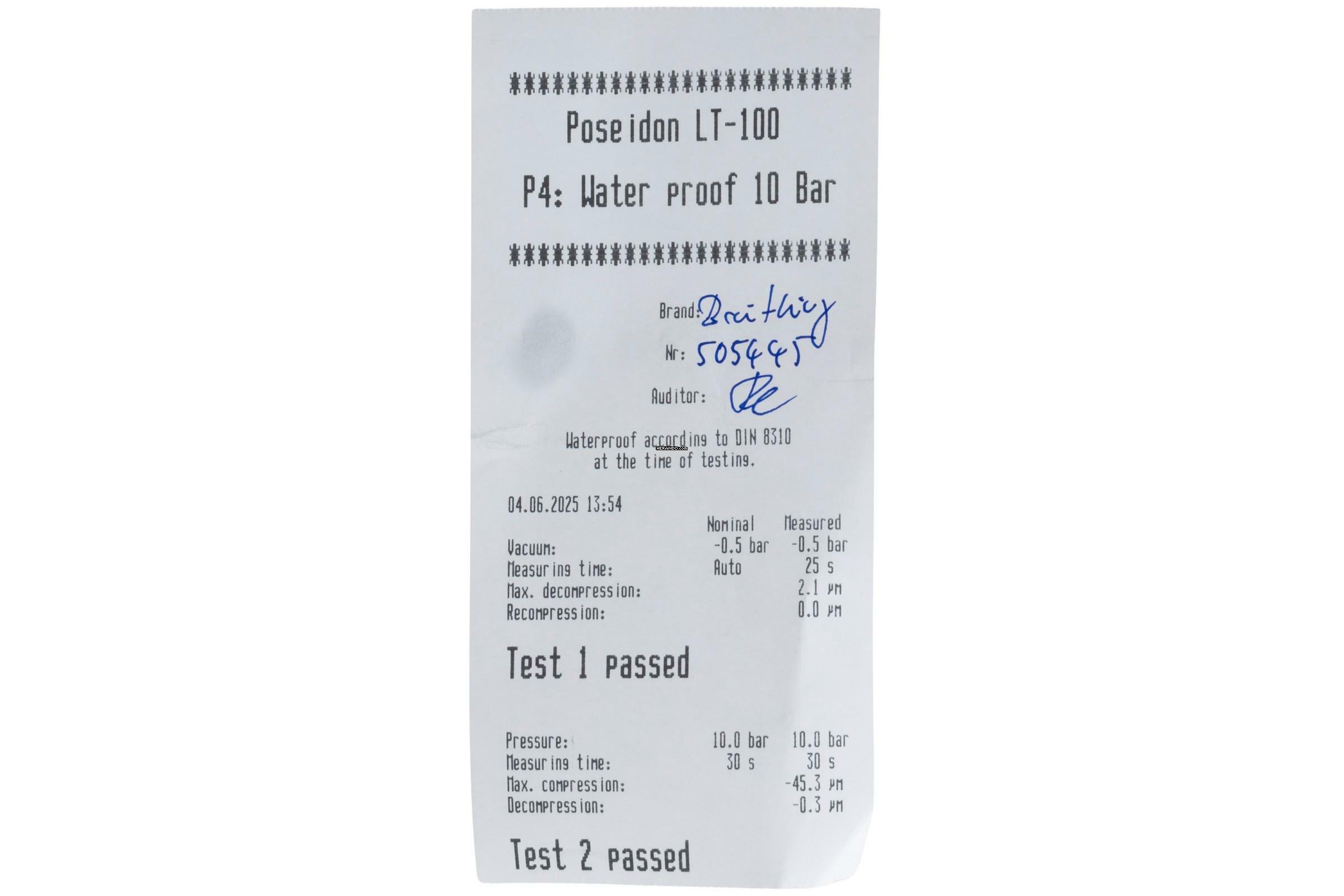 * Wenn die Uhr positiv auf Wasserdichtigkeit getestet wurde, dann gilt diese Eigenschaft zum Zeitpunkt der Messung. Wasserdichtigkeit ist nach DIN 8310 keine bleibende Eigenschaft. Sie sollte jährlich und vor besonderen Belastungen überprüft werden, da die eingebauten Dichtelemente in ihrer Funktion und im täglichen Gebrauch nachlassen. Einflüsse wie starke Temperaturschwankungen, Chlor, Seife oder Salzwasser wirken sich negativ auf die Wasserdichtigkeit aus.