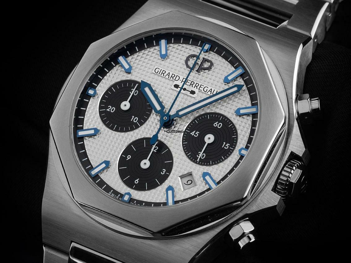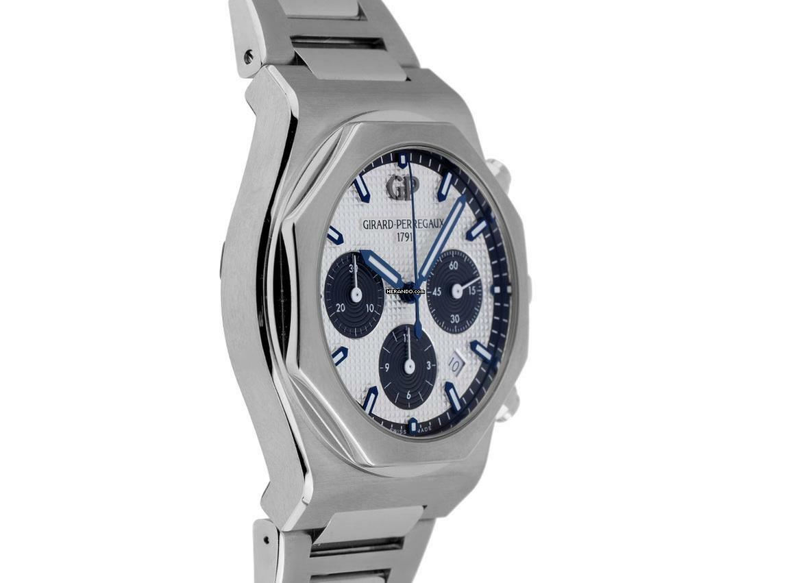 Girard Perregaux Laureato Chronograph Stahl Automatik Armband Stahl Gehäuse Edelstahl satiniert, Gehäusedurchmesser ohne Krone 42mm, Gehäusehöhe 12,3mm. Lünette Edelstahl 8-eckig poliert und satiniert. Armband Edelstahl poliert und satiniert, verdeckte Doppelsicherheitsfaltschließe Edelstahl mit Hersteller-Logo. Zifferblatt silberfarben mit Clous de Paris Dekor und aufgesetzten gebläuten Leuchtindexen und gebläuten Leuchtzeigern. Uhrwerk Automatik, Chronograph, Kaliber Girard Perregaux GP03300 mit 63 Edelsteinen. Anzeige von Stunde und Minute über Zeiger aus der Mitte, kleine Sekunde mit Sekundenstopp zur sekundengenauen Einstellung der Uhrzeit bei 3 Uhr, Datumsanzeige mit Schnellverstellung zwischen 4 und 5 Uhr. Saphirglas kratzfest. Krone verschraubbar mit Hersteller-Logo. Boden Edelstahl 6-fach verschraubt und graviert. Gewicht der Uhr inklusive Armband 172g, Länge des Armbandes inklusive Gehäuse 195mm. Wasserdicht bis 10 ATM. Referenznummer: 81020-11-131-11A, ID: ST1160269960525H-19600, Artikelnummer: 10000080361. Original Girard Perregaux Box mit Umkarton und Garantie Papiere von Mai 2025 sowie Beschreibung, Full Set. Ungetragen. Lieferzeit sofort. Inklusive Zertifikat / Uhrenpass mit einem Farbbild, der genauen Beschreibung sowie dem Wiederbeschaffungswert der Uhr über 19600,-€ und 1000 Tage Garantie ab Kaufdatum.