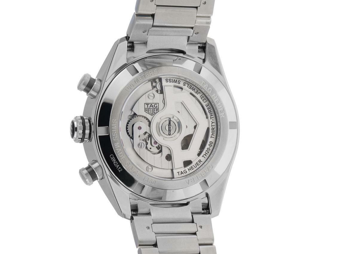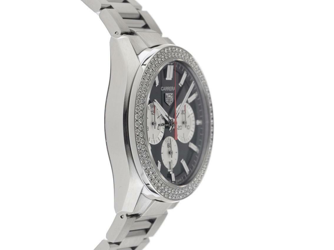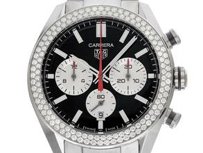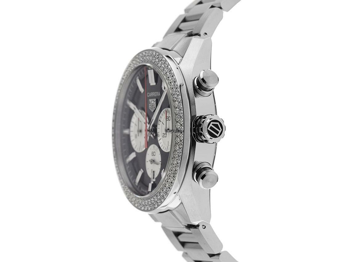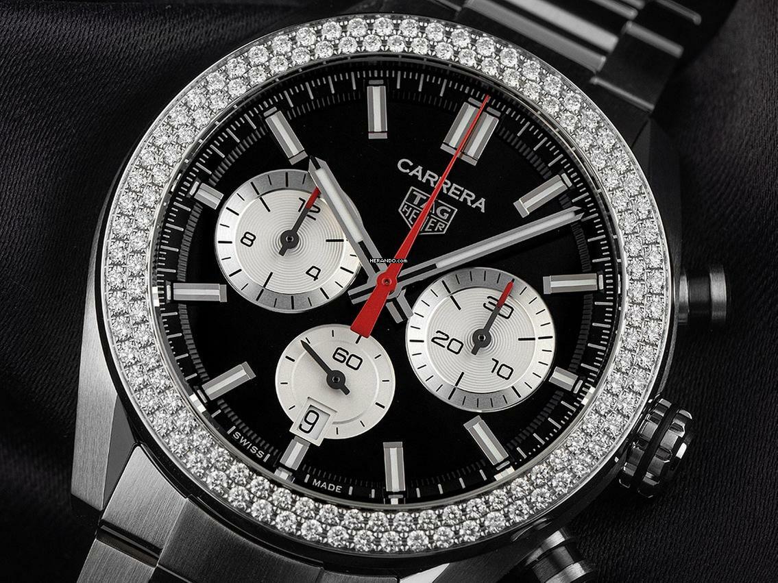 Tag Heuer Carrera Stahl Diamanten Automatik Chronograph Armband Stahl Gehäuse Edelstahl poliert und satiniert, Gehäusedurchmesser ohne Krone 44mm, Gehäusehöhe 15,3mm. Lünette Edelstahl mit Diamanten besetzt, zusammen ca. 1,38ct TW / VS (feines Weiß mit kleinen Einschlüssen). Armband Edelstahl poliert und satiniert, verdeckte Sicherheitsfaltschließe Edelstahl mit Hersteller-Logo. Zifferblatt schwarz mit aufgesetzten Edelstahl Leuchtindexen und Edelstahl Leuchtzeigern. Uhrwerk Automatik, Chronograph, Tag Heuer Manufakturkaliber TH20-00 mit 33 Edelsteinen, Gangreserve ca. 80 Stunden. Anzeige von Stunde und Minute über Zeiger aus der Mitte, kleine Sekunde mit Sekundenstopp zur sekundengenauen Einstellung der Uhrzeit bei 6 Uhr, Datumanzeige mit Schnellverstellung bei 6 Uhr. Saphirglas kratzfest und bombiert. Krone mit Hersteller-Logo. Boden Edelstahl verschraubt und graviert mit Saphirglas Sichtfenster. Gewicht der Uhr inklusive Armband 191g, Länge des Armbandes inklusive Gehäuse 205mm, Wasserdicht bis 10 ATM. Referenznummer: CBN2A12.BA0643, ID: ST1160196100325H-15700, Artikelnummer: 10000079199. Original Tag Heuer Box mit Umkarton und Garantie Papiere von März 2025, Full Set. Ungetragen. Lieferzeit sofort.