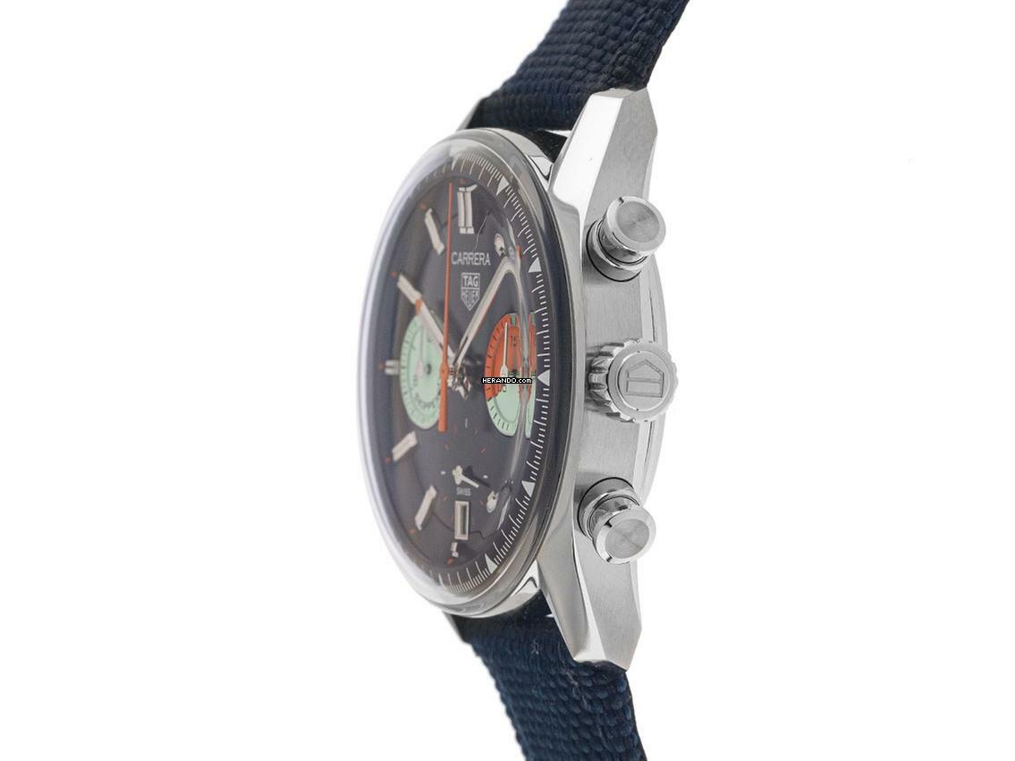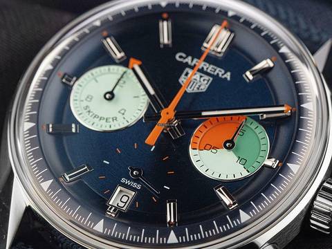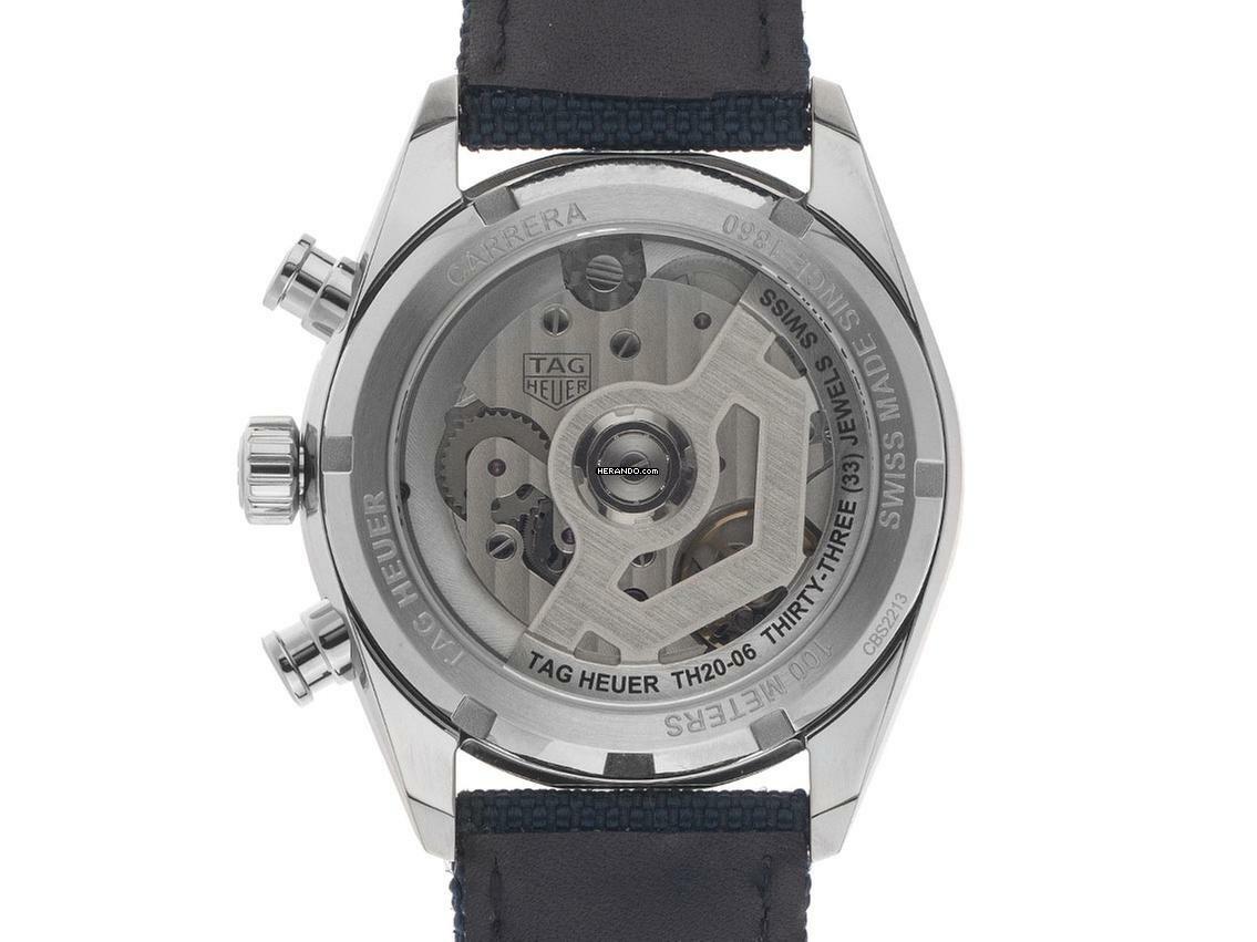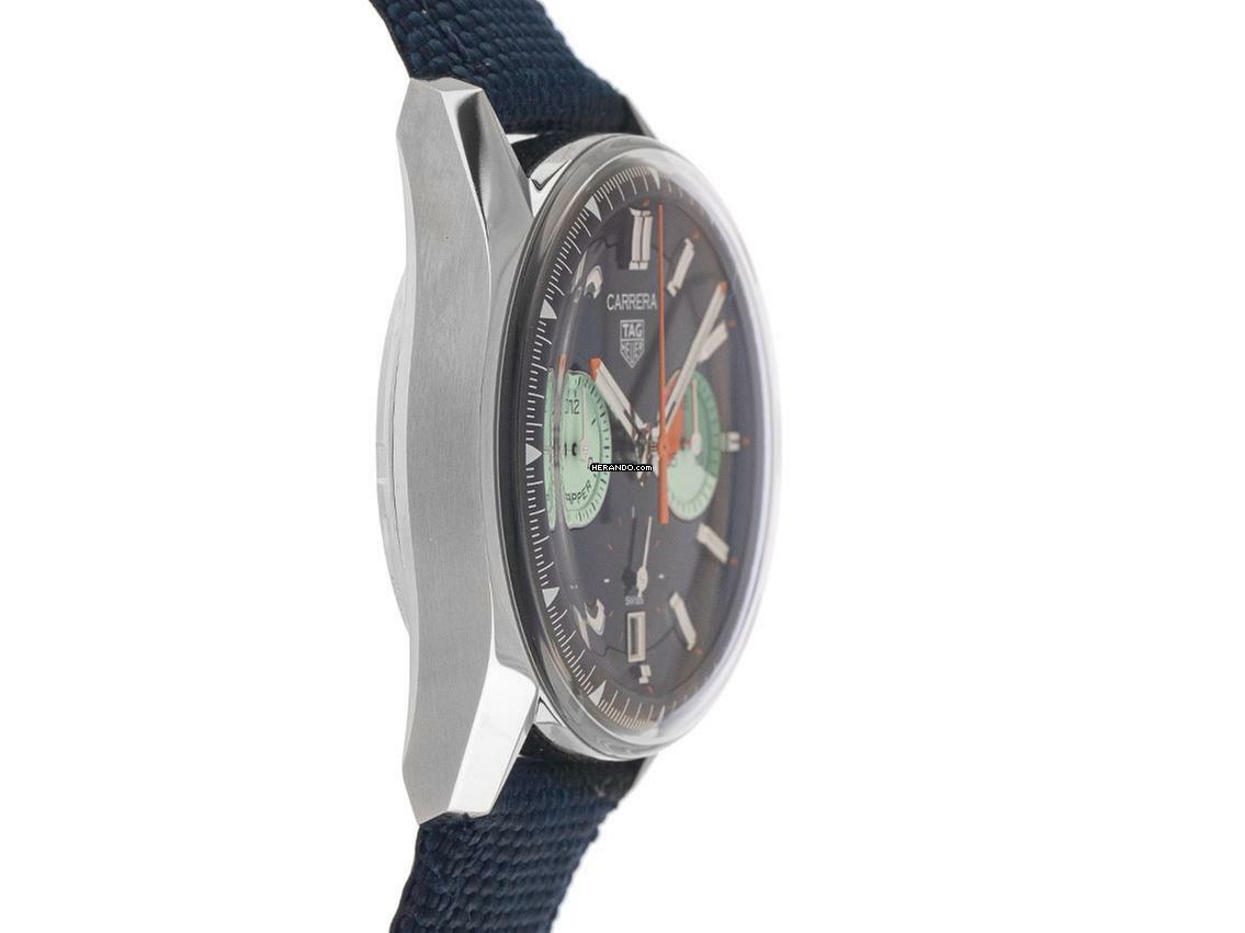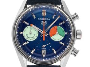 Tag Heuer Carrera Skipper Stahl Automatik Armband Textil / Leder Faltschließe Gehäuse Edelstahl poliert und satiniert, Gehäusedurchmesser ohne Krone 39mm, Gehäusehöhe 13,9mm. Armband Textil / Leder blau mit Ziernaht, Anstoßbreite 20mm, Faltschließe Edelstahl mit Hersteller-Logo. Zifferblatt blau gebürstet mit aufgesetzten Edelstahl Indexen und Edelstahl Leuchtzeigern. Uhrwerk Automatik, Chronograph, Kaliber Tag Heuer Calibre TH20-06 mit 33 Edelsteinen, Gangreserve ca. 80 Stunden. Anzeige von Stunde und Minute über Zeiger aus der Mitte, kleine Sekunde mit Sekundenstopp zur sekundengenauen Einstellung der Uhrzeit bei 6 Uhr, Datumsanzeige mit Schnellverstellung bei 6 Uhr. Saphirglas kratzfest und gewölbt. Krone mit Hersteller-Logo. Boden Edelstahl verschraubt und graviert mit Saphirglas Sichtfenster. Gewicht der Uhr inklusive Armband 92g. Wasserdicht bis 10 ATM. Referenznummer: CBS2213.FN6002, ID: ST116090160425H-7150, Artikelnummer: 10000079713. Original Tag Heuer Box mit Umkarton und Garantie Papiere von April 2025 sowie Beschreibung, Full Set. Ungetragen. Neuheit 2025. Lieferzeit sofort. Inklusive certified pre owned Zertifikat / Uhrenpass mit einem Farbbild, der genauen Beschreibung sowie dem Wiederbeschaffungswert der Uhr über 7150,-€ und 1000 Tage Garantie ab Kaufdatum.
