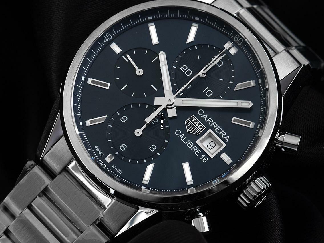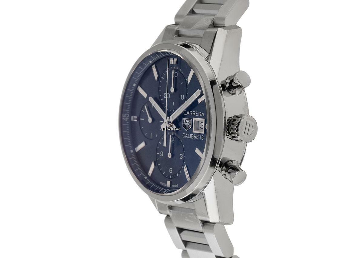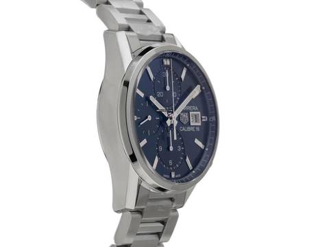 Tag Heuer Carrera Calibre 16 Stahl Automatik Chronograph Armband Stahl Gehäuse Edelstahl poliert und satiniert, Gehäusedurchmesser ohne Krone 41mm, Gehäusehöhe 15,9mm. Lünette Edelstahl glatt und poliert. Armband Edelstahl, Sicherheitsfaltschließe Edelstahl mit Hersteller-Logo. Zifferblatt blau mit aufgesetzten Edelstahl Leuchtindexen und polierten Edelstahl Leuchtzeigern. Uhrwerk Automatik, Chronograph, Tag Heuer Kaliber 16 mit 25 Edelsteinen, Gangreserve ca. 42 Stunden. Anzeige von Stunde und Minute über Zeiger aus der Mitte, kleine Sekunde mit Sekundenstopp zur sekundengenauen Einstellung der Uhrzeit bei 9 Uhr, Datumsanzeige mit Schnellverstellung bei 3 Uhr. Saphirglas kratzfest und gewölbt. Krone mit Hersteller-Logo. Boden Edelstahl verschraubt und graviert mit Saphirglas Sichtfenster. Gewicht der Uhr inklusive Armband 180g, Länge des Armbandes inklusive Gehäuse 185mm. Wasserdicht bis 10 ATM. Referenznummer: CBK2112.BA0715, ID: ST116065161224H-5150, Artikelnummer: 10000077659. Original Tag Heuer Box mit Umkarton und Garantie Papiere von Dezember 2024 sowie Beschreibung, Full Set. Ungetragen. Lieferzeit sofort.