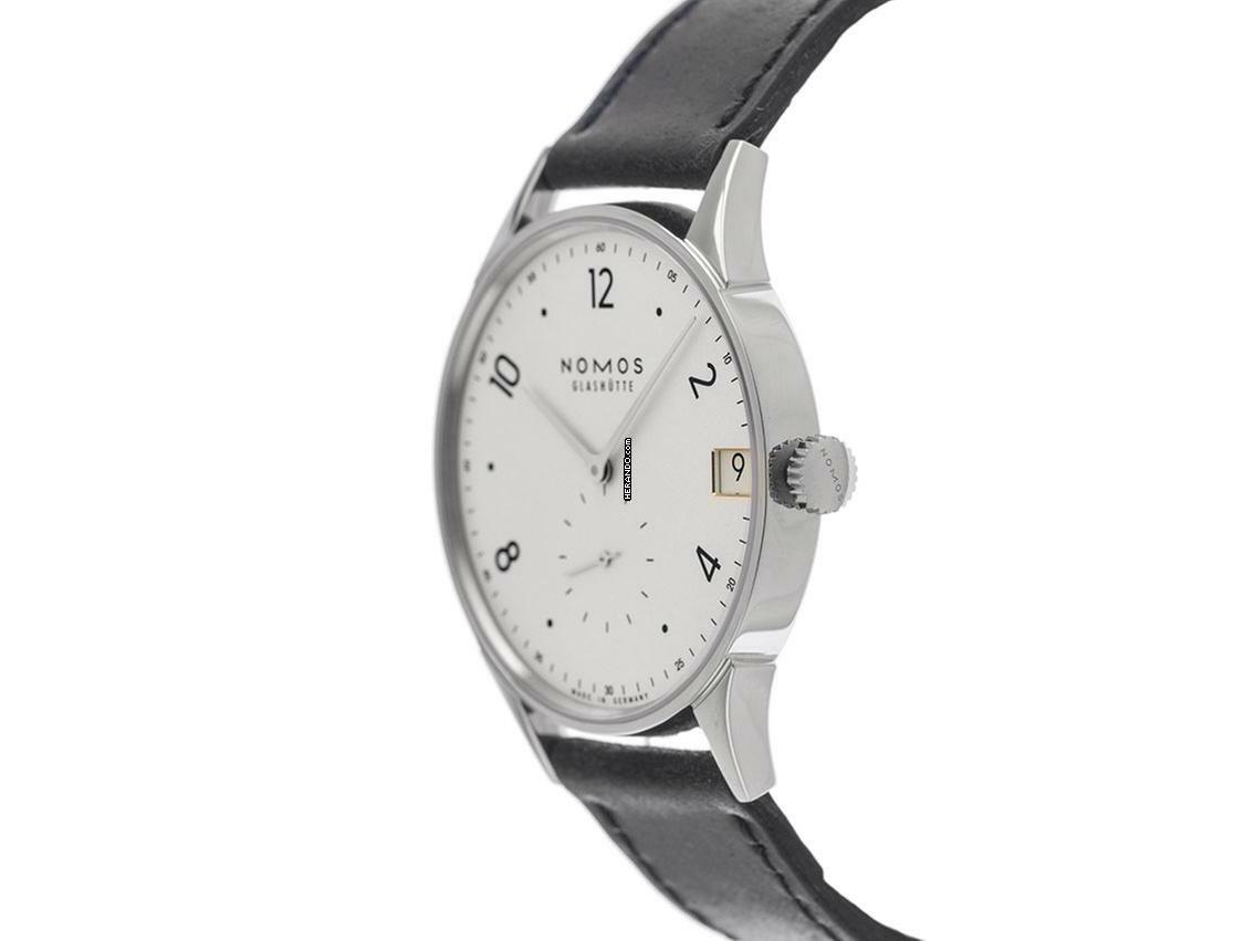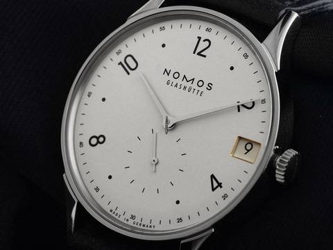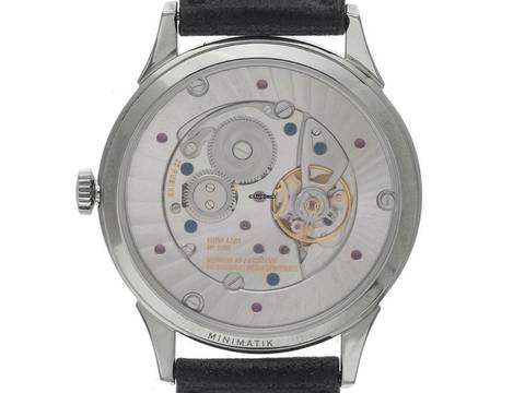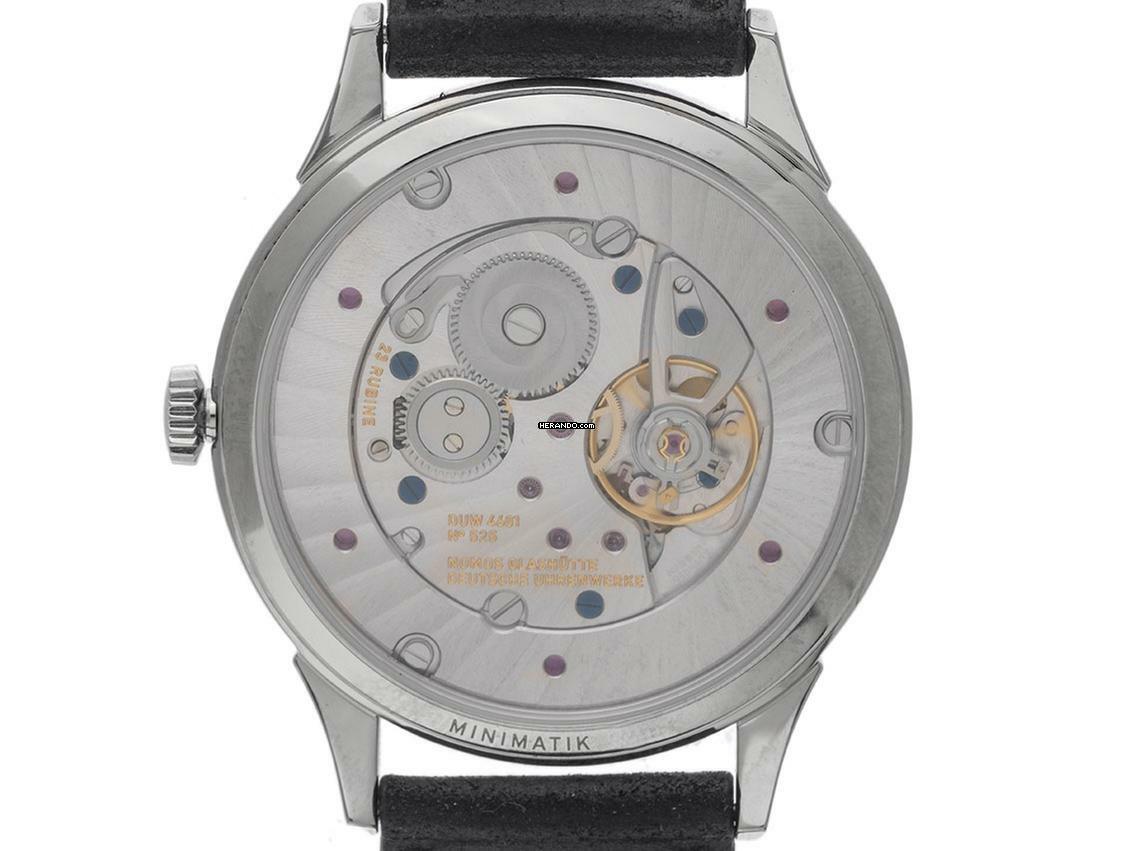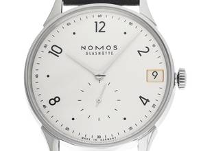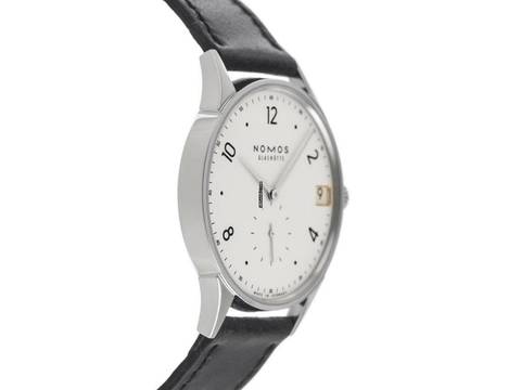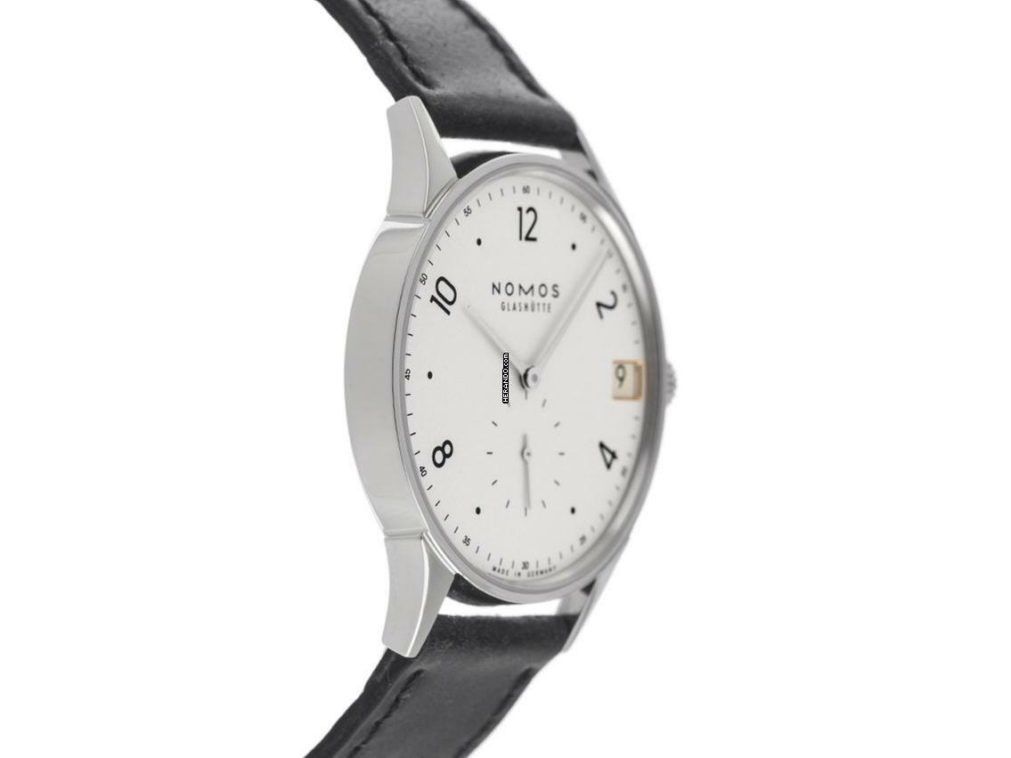 Nomos Glashütte Minimatik Stahl Automatik Armband Leder Gehäuse Edelstahl poliert, dreiteilig, Gehäusedurchmesser ohne Krone 35,5mm, Gehäusehöhe 7,5mm. Armband Leder, pflanzlich gegerbt, handgenäht. Anstoßbreite 19mm, Stiftschließe Edelstahl mit Hersteller-Logo. Zifferblatt silberfarben galvanisiert mit schwarzen arabischen Ziffern und schwarzen Punkt Indexen, schwarzer Minuterie sowie rhodinierten Edelstahl Zeigern. Uhrwerk handaufzug, Nomos Manufakturkaliber DUW4601 mit 23 Edelsteinen, Gangreserve ca. 52 Stunden. Anzeige von Stunde und Minute über Zeiger aus der Mitte, kleine Sekunde mit Sekundenstopp zur sekundengenauen Einstellung der Uhrzeit bei 6 Uhr. Saphirglas kratzfest. Krone geriffelt mit Hersteller-Logo. Boden Edelstahl graviert mit Saphirglas Sichtfenster. Gewicht der Uhr inklusive Armband 49g. Wasserdicht bis 3 ATM. Referenznummer: 1250, ID: ST116037000625H-2680, Artikelnummer: 10000080795. Original Nomos Glashütte Box mit Umkarton und Garantie Papiere von Juni 2025, Full Set. Neu. Lieferzeit sofort. Inklusive Uhrenpass mit einem Farbbild, der genauen Beschreibung sowie dem Wiederbeschaffungswert der Uhr über 2680,-€ und 1000 Tage Garantie ab Kaufdatum.
