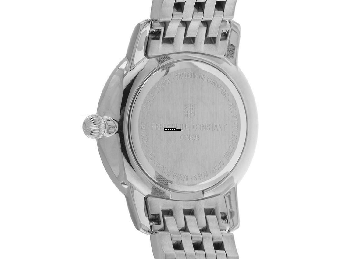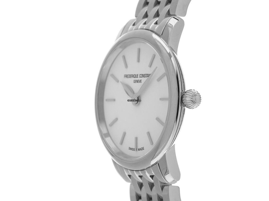 Frederique Constant Ultra Slim Ladies Stahl Quarz Armband Stahl Gehäuse Edelstahl poliert, Gehäusedurchmesser ohne Krone 25mm, Gehäusehöhe 5,6mm. Lünette Edelstahl und poliert. Armband Edelstahl poliert, verdeckte Doppelsicherheitsfaltschließe Edelstahl poliert mit Hersteller-Logo. Zifferblatt weiß mit aufgesetzten Edelstahl Indexen und Edelstahl Zeigern. Uhrwerk quarzgesteuert, Kaliber Frederique Constant. Anzeige von Stunde und Minute über Zeiger aus der Mitte. Saphirglas kratzfest und gewölbt. Zwiebelkrone. Boden Edelstahl verschraubt und graviert. Gewicht der Uhr inklusive Armband 50g, Länge des Armbandes inklusive Gehäuse 180mm. Wasserdicht bis 3 ATM. Referenznummer: FC-200S6B, ID: ST25468260225H-825, Artikelnummer: 10000078831. Original Frederique Constant Box mit Umkarton und Garantie Papiere, Full Set. Neu. Lieferzeit sofort.