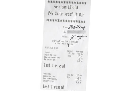 * Wenn die Uhr positiv auf Wasserdichtigkeit getestet wurde, dann gilt diese Eigenschaft zum Zeitpunkt der Messung. Wasserdichtigkeit ist nach DIN 8310 keine bleibende Eigenschaft. Sie sollte jährlich und vor besonderen Belastungen überprüft werden, da die eingebauten Dichtelemente in ihrer Funktion und im täglichen Gebrauch nachlassen. Einflüsse wie starke Temperaturschwankungen, Chlor, Seife oder Salzwasser wirken sich negativ auf die Wasserdichtigkeit aus.