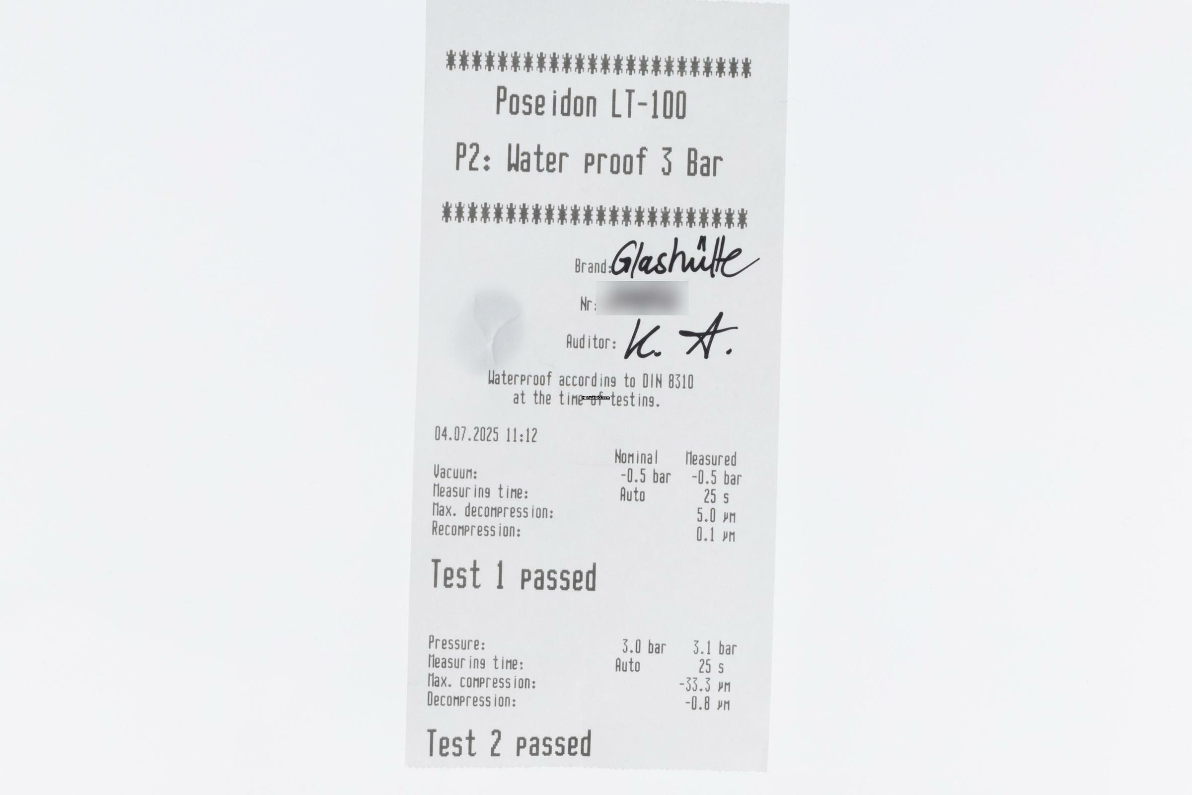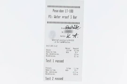 * Wenn die Uhr positiv auf Wasserdichtigkeit getestet wurde, dann gilt diese Eigenschaft zum Zeitpunkt der Messung. Wasserdichtigkeit ist nach DIN 8310 keine bleibende Eigenschaft. Sie sollte jährlich und vor besonderen Belastungen überprüft werden, da die eingebauten Dichtelemente in ihrer Funktion und im täglichen Gebrauch nachlassen. Einflüsse wie starke Temperaturschwankungen, Chlor, Seife oder Salzwasser wirken sich negativ auf die Wasserdichtigkeit aus.