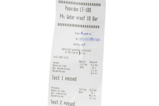 * Wenn die Uhr positiv auf Wasserdichtigkeit getestet wurde, dann gilt diese Eigenschaft zum Zeitpunkt der Messung. Wasserdichtigkeit ist nach DIN 8310 keine bleibende Eigenschaft. Sie sollte jährlich und vor besonderen Belastungen überprüft werden, da die eingebauten Dichtelemente in ihrer Funktion und im täglichen Gebrauch nachlassen. Einflüsse wie starke Temperaturschwankungen, Chlor, Seife oder Salzwasser wirken sich negativ auf die Wasserdichtigkeit aus.