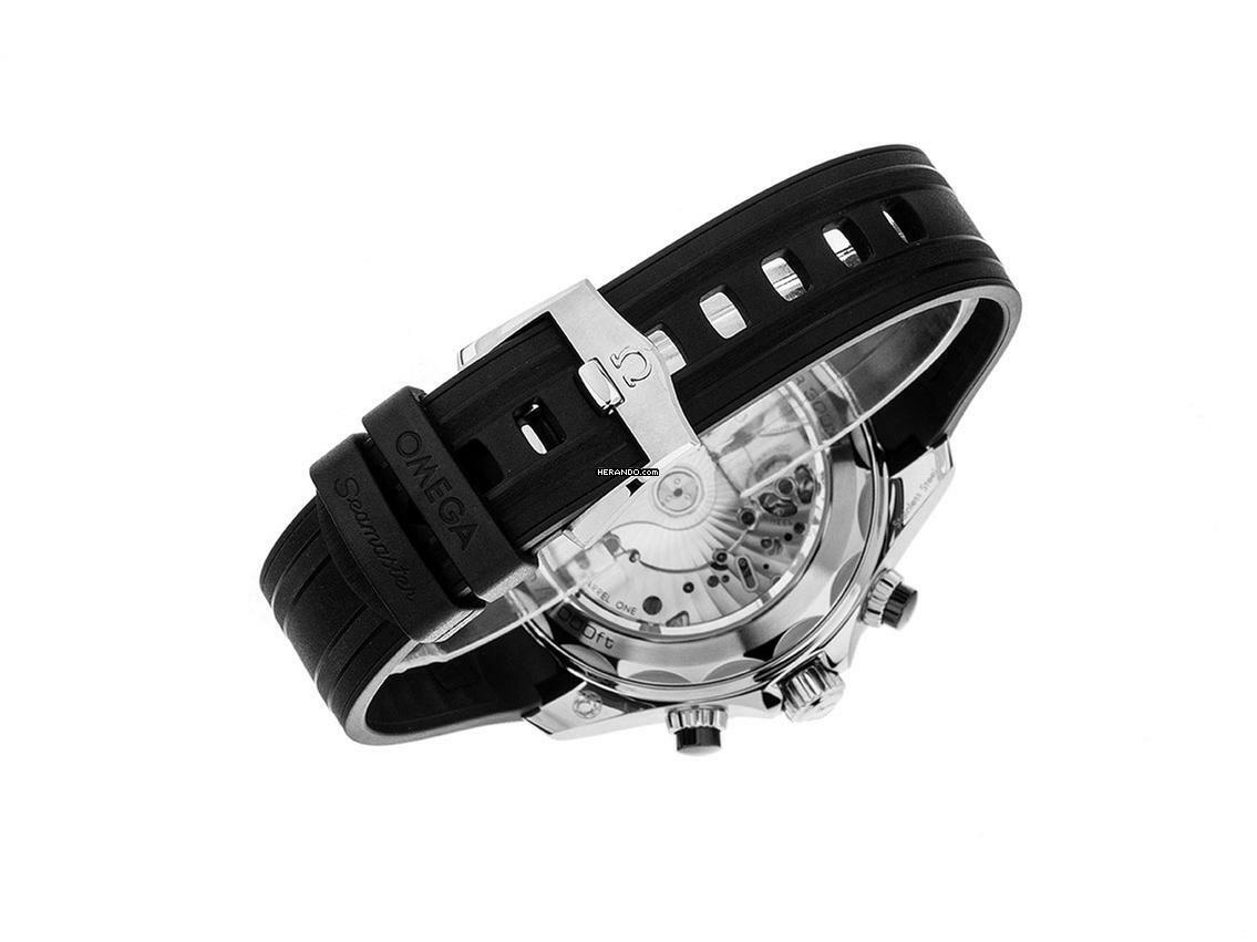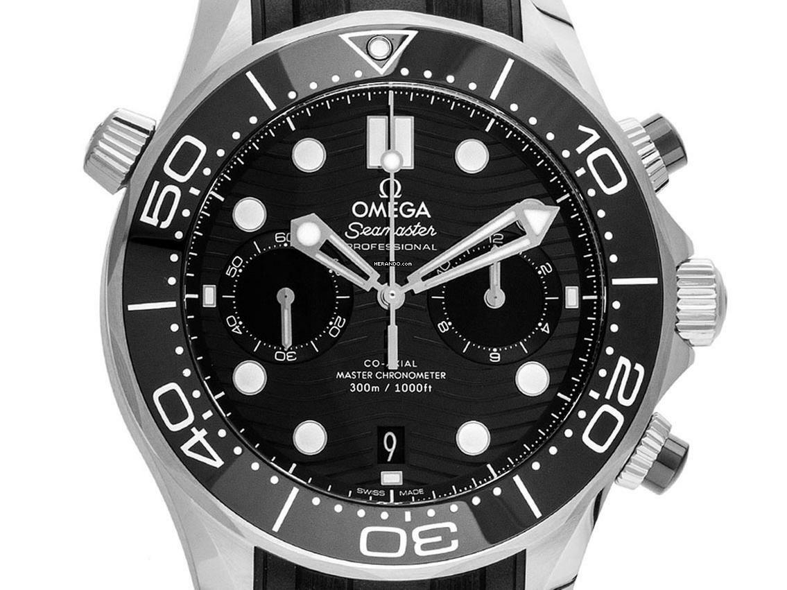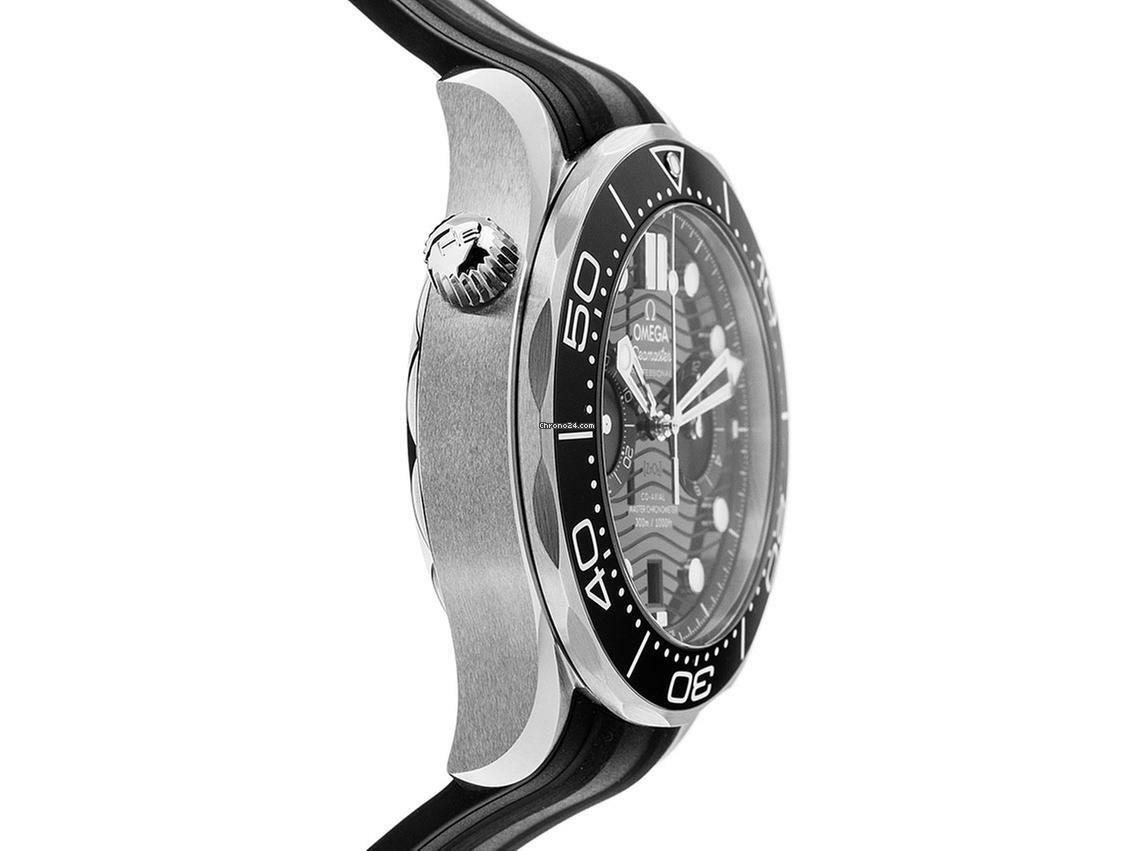 Omega Seamaster Diver 300m Co-Axial Master Chronometer Stahl Keramik Automatik Chronograph Armband Kautschuk Gehäuse Edelstahl poliert und satiniert, Gehäusedurchmesser ohne Krone 44mm, Gehäusehöhe 17,2mm. Lünette Edelstahl mit schwarzem Keramik Inlay, 60-Minuten Skala und Leuchtpunkt, einseitig drehbar. Heliumventil bei 10 Uhr. Armband Kautschuk schwarz, Anstoßbreite 21mm, Stiftschließe Edelstahl mit Hersteller-Logo. Zifferblatt schwarz mit lasergraviertem Wellen-Muster, aufgesetzten Leuchtindexen und Leuchtpunkten sowie skelettierten Edelstahl Leuchtzeigern. Uhrwerk Automatik, Chronometer mit Zeugnis, OMEGA Master Chronometer-Kaliber 9900 mit 54 Edelsteinen, Co-Axial Hemmung, Gangreserve ca. 60 Stunden. Anzeige von Stunde und Minute über Zeiger aus der Mitte, kleine Sekunde mit Sekundenstopp zur sekundengenauen Einstellung der Uhrzeit bei 9 Uhr, Datumsanzeige mit Schnellverstellung bei 6 Uhr. Saphirglas kratzfest, gewölbt und doppelseitig entspiegelt. Krone verschraubbar mit Flankenschutz und Hersteller-Logo. Boden Edelstahl verschraubt und graviert mit Saphirglas Sichtfenster. Gewicht der Uhr inklusive Armband 142g. Wasserdicht bis 30 ATM. Referenznummer: 210.32.44.51.01.001, ID: ST1160127000325H-9000, Artikelnummer: 10000079306. Original Omega Box mit Umkarton und Garantie Papiere von März 2025 Beschreibung, Full Set. Ungetragen. Lieferzeit sofort.