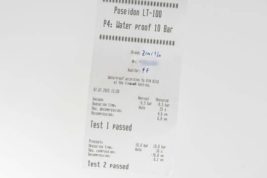 * Wenn die Uhr positiv auf Wasserdichtigkeit getestet wurde, dann gilt diese Eigenschaft zum Zeitpunkt der Messung. Wasserdichtigkeit ist nach DIN 8310 keine bleibende Eigenschaft. Sie sollte jährlich und vor besonderen Belastungen überprüft werden, da die eingebauten Dichtelemente in ihrer Funktion und im täglichen Gebrauch nachlassen. Einflüsse wie starke Temperaturschwankungen, Chlor, Seife oder Salzwasser wirken sich negativ auf die Wasserdichtigkeit aus.