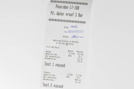 * Wenn die Uhr positiv auf Wasserdichtigkeit getestet wurde, dann gilt diese Eigenschaft zum Zeitpunkt der Messung. Wasserdichtigkeit ist nach DIN 8310 keine bleibende Eigenschaft. Sie sollte jährlich und vor besonderen Belastungen überprüft werden, da die eingebauten Dichtelemente in ihrer Funktion und im täglichen Gebrauch nachlassen. Einflüsse wie starke Temperaturschwankungen, Chlor, Seife oder Salzwasser wirken sich negativ auf die Wasserdichtigkeit aus.