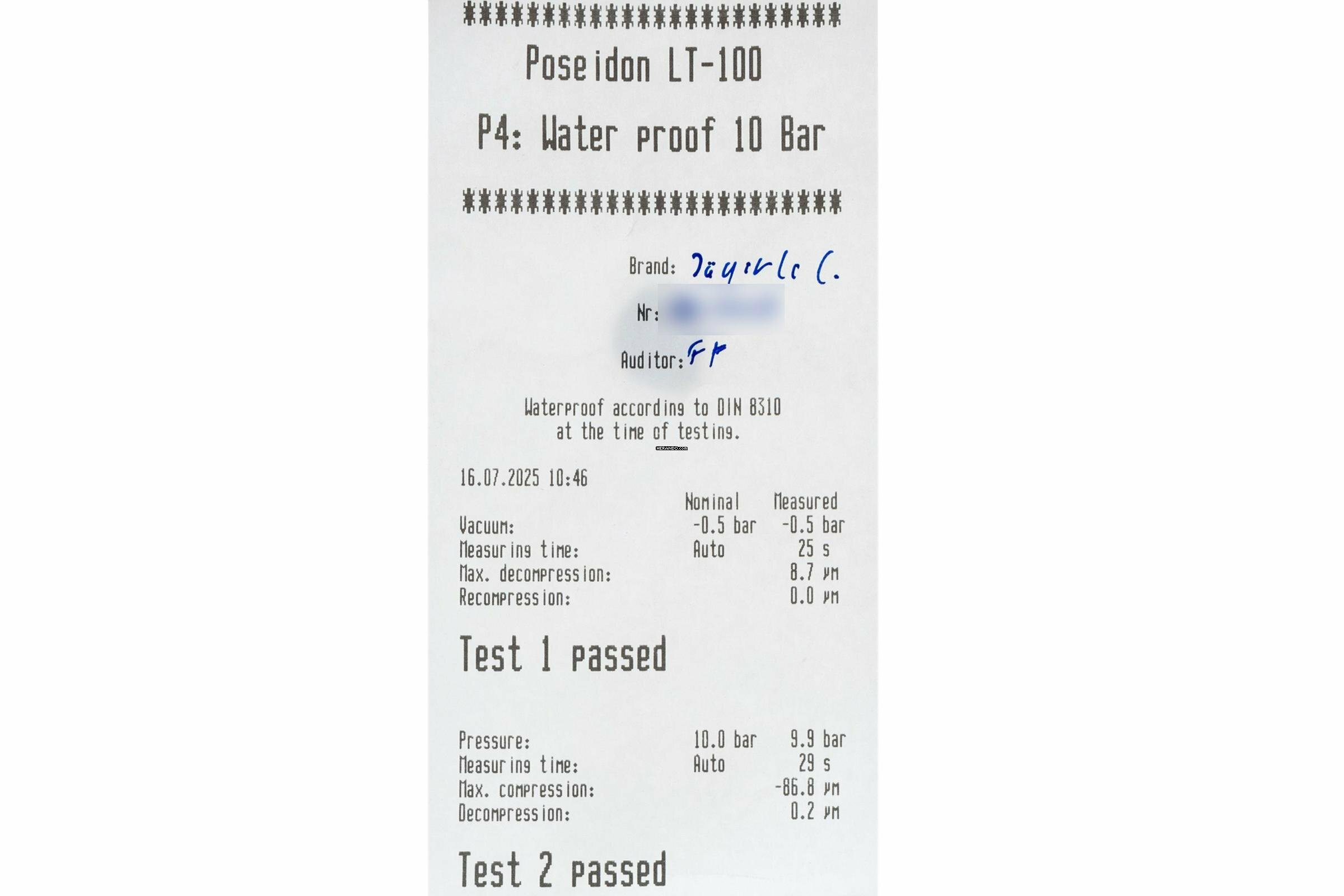 - Wasserdichtigkeit*: ja. Das Prüfprotokoll mit Prüfdruckangabe liegt bei.