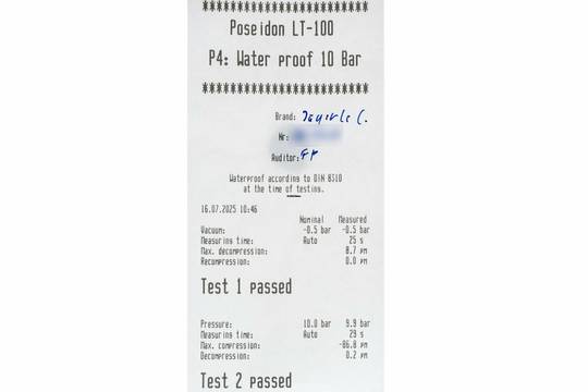 * Wenn die Uhr positiv auf Wasserdichtigkeit getestet wurde, dann gilt diese Eigenschaft zum Zeitpunkt der Messung. Wasserdichtigkeit ist nach DIN 8310 keine bleibende Eigenschaft. Sie sollte jährlich und vor besonderen Belastungen überprüft werden, da die eingebauten Dichtelemente in ihrer Funktion und im täglichen Gebrauch nachlassen. Einflüsse wie starke Temperaturschwankungen, Chlor, Seife oder Salzwasser wirken sich negativ auf die Wasserdichtigkeit aus.