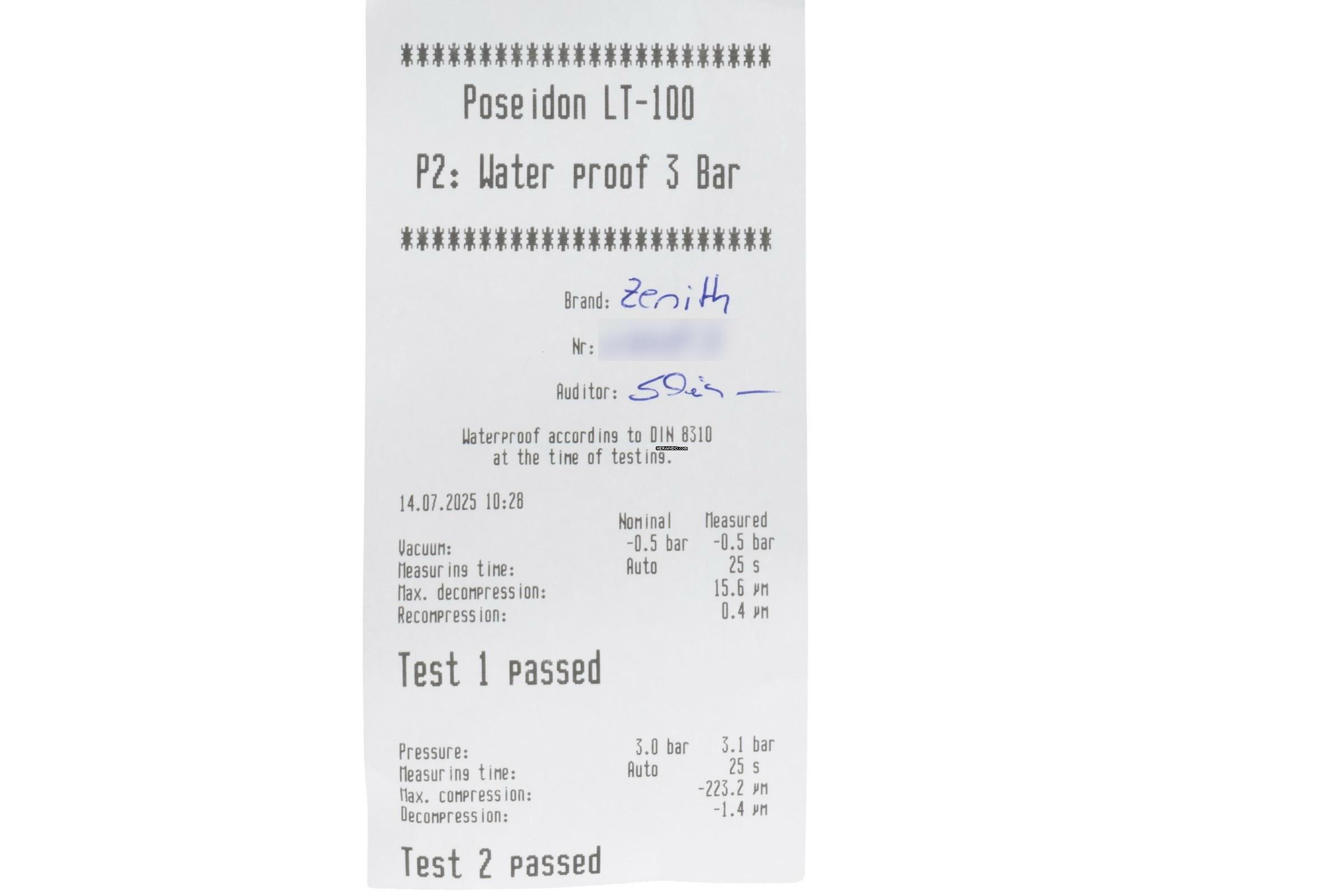 * Wenn die Uhr positiv auf Wasserdichtigkeit getestet wurde, dann gilt diese Eigenschaft zum Zeitpunkt der Messung. Wasserdichtigkeit ist nach DIN 8310 keine bleibende Eigenschaft. Sie sollte jährlich und vor besonderen Belastungen überprüft werden, da die eingebauten Dichtelemente in ihrer Funktion und im täglichen Gebrauch nachlassen. Einflüsse wie starke Temperaturschwankungen, Chlor, Seife oder Salzwasser wirken sich negativ auf die Wasserdichtigkeit aus.