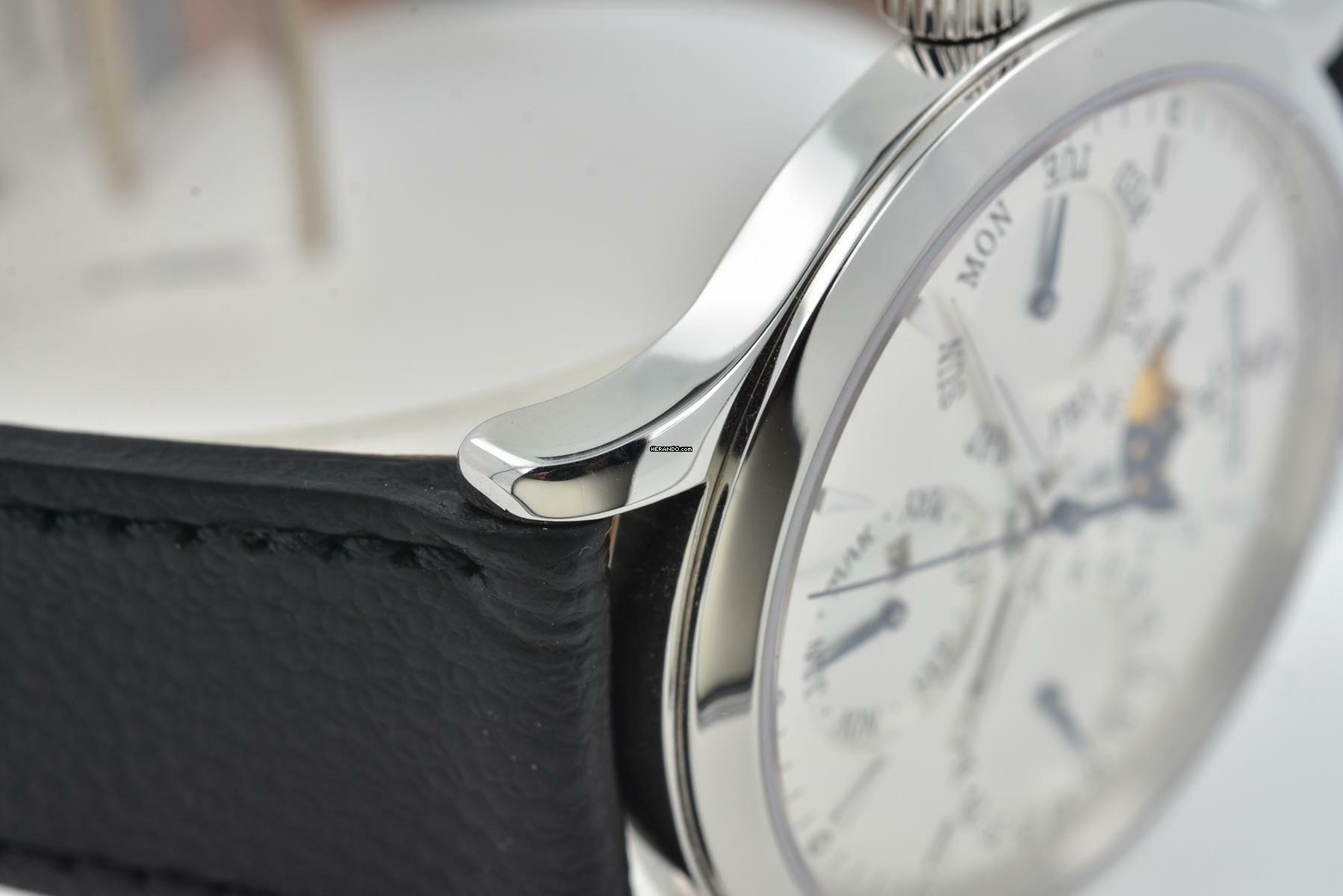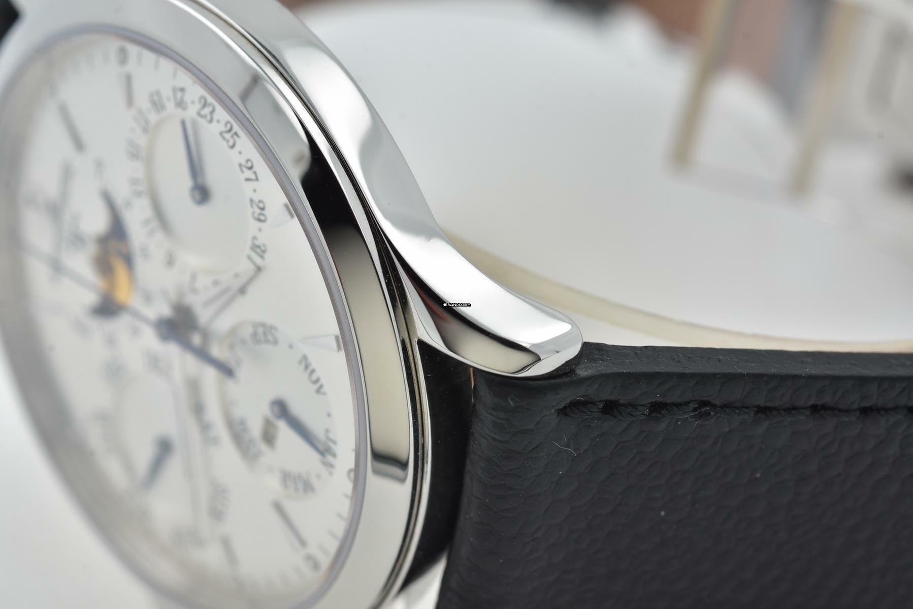 Uhrwerk: Jaeger LeCoultre Automatikwerk, Stunden- Minutenzeiger und kleiner Sekundenzeiger, Datum, Tag und Monat (englisch), Mondphase, Jahr