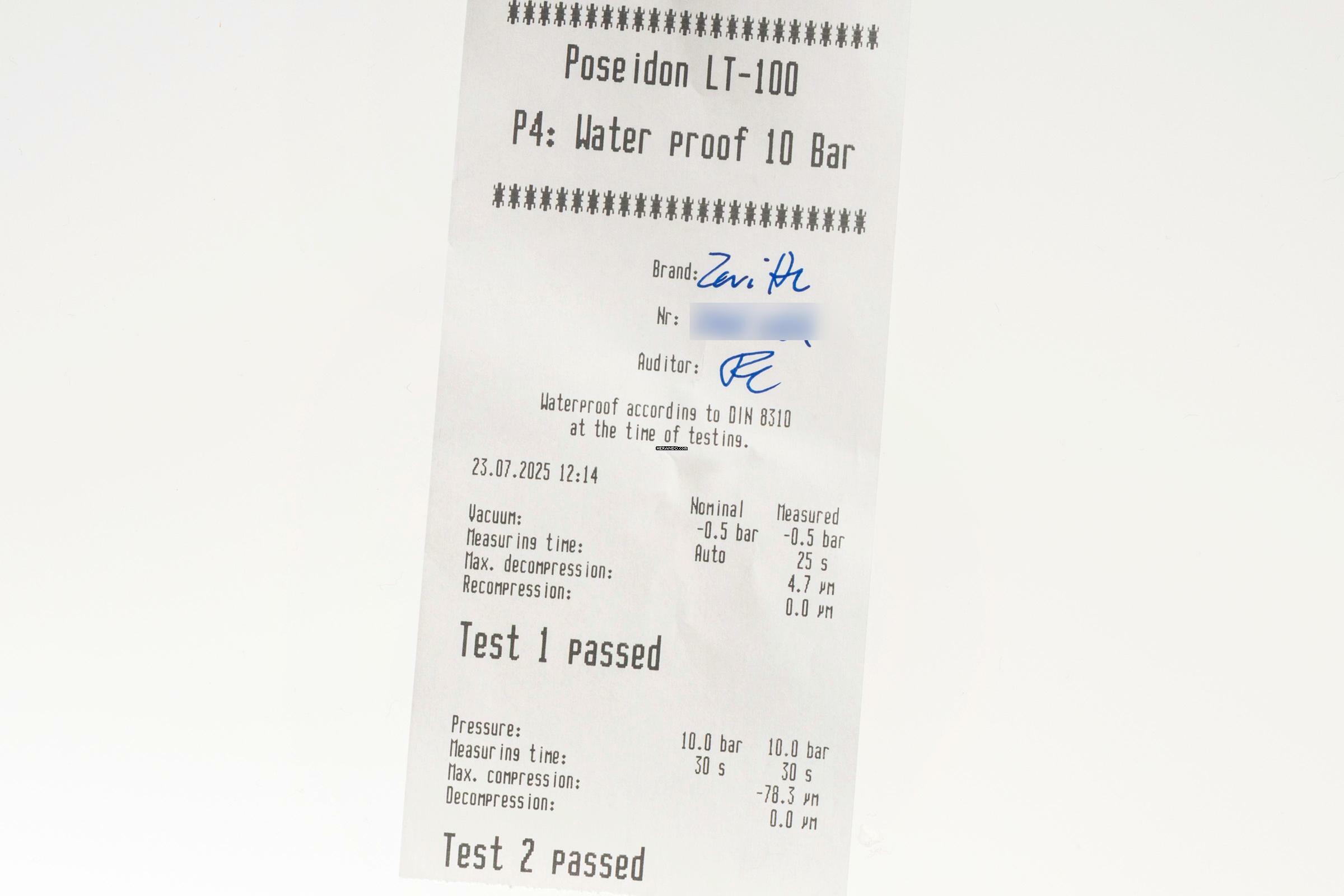 - Wasserdichtigkeit*: ja. Das Prüfprotokoll mit Prüfdruckangabe liegt bei.